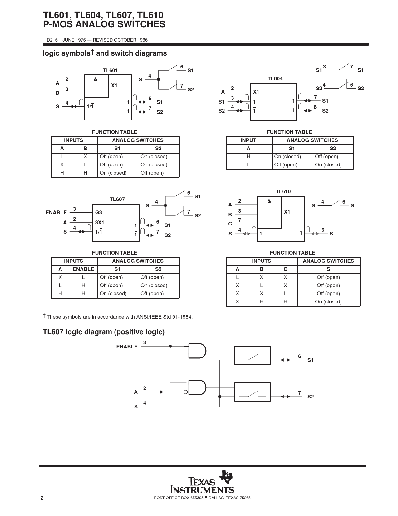 TL601, TL604, TL607, TL610 P-MOS ANALOG SWITCHES. logic symbols† and switch diagrams. TL601. &. TL604. 1/1. FUNCTION TABLE