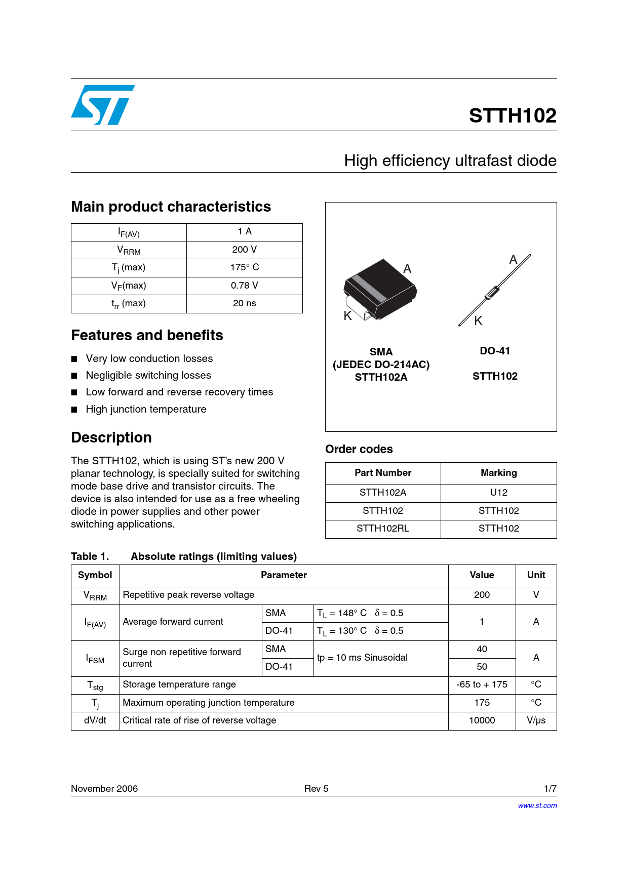 STTH102 High efficiency ultrafast diode Main product characteristics IF(AV) 1 A VRRM 200 V A Tj (max) 175° C A VF(max) 0.78 V trr (max) 20 ns K K Features and benefitsSMADO-41 ■ Very low conduction losses (JEDEC DO-214AC) ■ Negligible switching losses STTH102ASTTH102 ■ Low forward and reverse recovery times ■ High junction temperature DescriptionOrder codes The STTH102, which is using ST’s new 200 V planar technology, is specially suited for switching Part NumberMarking mode base drive and transistor circuits. The STTH102A U12 device is also intended for use as a free wheeling diode in power supplies and other power STTH102 STTH102 switching applications. STTH102RL STTH102 Table 1.Absolute ratings (limiting values)SymbolParameterValueUnit VRRM Repetitive peak reverse voltage 200 V SMA TL = 148° C δ = 0.5 IF(AV) Average forward current 1 A DO-41 TL = 130° C δ = 0.5 Surge non repetitive forward SMA 40 IFSM tp = 10 ms Sinusoidal A current DO-41 50 Tstg Storage temperature range -65 to + 175 °C Tj Maximum operating junction temperature 175 °C dV/dt Critical rate of rise of reverse voltage 10000 V/µs November 2006 Rev 5 1/7 www.st.com 7 Document Outline STTH102 High efficiency ultrafast diode Table 1. Absolute ratings (limiting values) 1 Characteristics Table 2. Thermal resistance Table 3. Static Electrical Characteristics Table 4. Dynamic electrical characteristics Figure 1. Average forward power dissipation versus average forward current (SMA) Figure 2. Average forward power dissipation versus average forward current (DO-41) Figure 3. Average forward current versus ambient temperature (d = 0.5) (SMA) Figure 4. Average forward current versus ambient temperature (d = 0.5) (DO-41) Figure 5. Relative variation of thermal impedance junction to ambient versus pulse duration (epoxy printed circuit board, e(Cu) = 35 µm, recommended pad layout) (SMA) Figure 6. Relative variation of thermal impedance junction to ambient versus pulse duration (DO-41) Figure 7. Forward voltage drop versus forward current Figure 8. Junction capacitance versus reverse voltage applied (typical values) Figure 9. Reverse recovery time versus dIF/dt (90% confidence) Figure 10. Peak recovery current versus dIF/dt (90% confidence) Figure 11. Reverse recovery charges versus dIF/dt (90% confidence) Figure 12. Relative variations of dynamic parameters versus junction temperature Figure 13. Thermal resistance junction to ambient versus copper surface under each lead (Epoxy printed circuit board FR4, copper thickness: 35 µm) (SMA) Figure 14. Thermal resistance versus lead length (DO-41) 2 Package information Table 5. SMA Dimensions Figure 15. Footprint (dimensions in mm) Table 6. DO-41 (Plastic) Package dimensions 3 Ordering information 4 Revision history