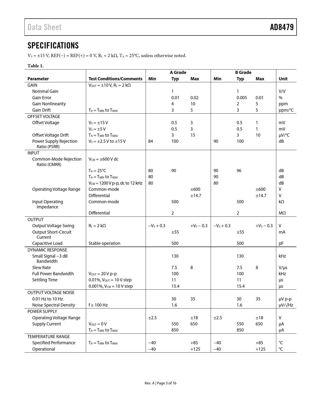 Data Sheet. AD8479. SPECIFICATIONS. Table 1. A Grade. B Grade. Parameter. Test Conditions/Comments Min. Typ. Max. Min. Unit