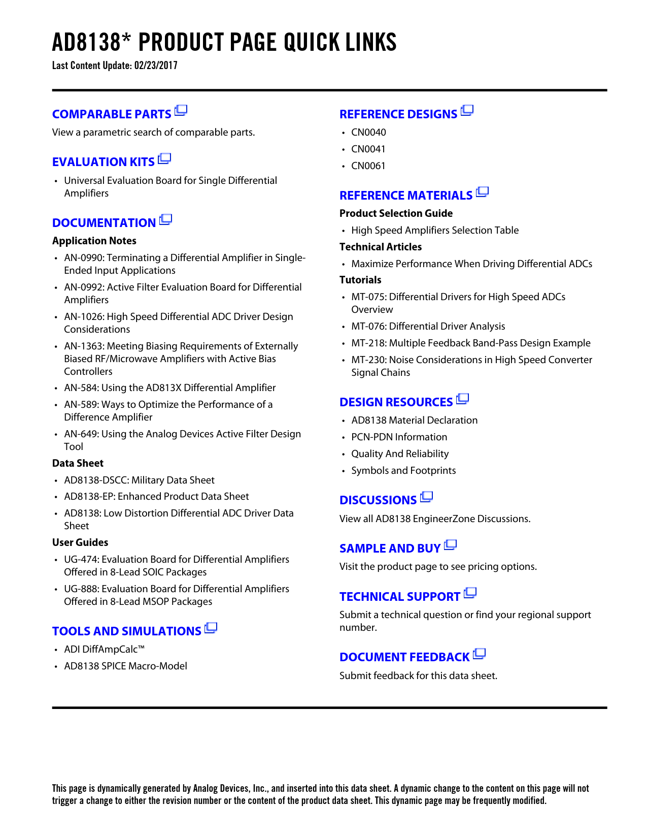 AD8138* PRODUCT PAGE QUICK LINKS Last Content Update: 02/23/2017COMPARABLE PARTSREFERENCE DESIGNS View a parametric search of comparable parts. • CN0040 • CN0041 EVALUATION KITS • CN0061 • Universal Evaluation Board for Single Differential Amplifiers REFERENCE MATERIALSProduct Selection GuideDOCUMENTATION • High Speed Amplifiers Selection Table Application NotesTechnical Articles • AN-0990: Terminating a Differential Amplifier in Single- • Maximize Performance When Driving Differential ADCs Ended Input Applications Tutorials • AN-0992: Active Filter Evaluation Board for Differential Amplifiers • MT-075: Differential Drivers for High Speed ADCs Overview • AN-1026: High Speed Differential ADC Driver Design Considerations • MT-076: Differential Driver Analysis • AN-1363: Meeting Biasing Requirements of Externally • MT-218: Multiple Feedback Band-Pass Design Example Biased RF/Microwave Amplifiers with Active Bias • MT-230: Noise Considerations in High Speed Converter Controllers Signal Chains • AN-584: Using the AD813X Differential Amplifier • AN-589: Ways to Optimize the Performance of a DESIGN RESOURCES Difference Amplifier • AD8138 Material Declaration • AN-649: Using the Analog Devices Active Filter Design • PCN-PDN Information Tool • Quality And Reliability Data Sheet • Symbols and Footprints • AD8138-DSCC: Military Data Sheet • AD8138-EP: Enhanced Product Data Sheet DISCUSSIONS • AD8138: Low Distortion Differential ADC Driver Data View all AD8138 EngineerZone Discussions. Sheet User GuidesSAMPLE AND BUY • UG-474: Evaluation Board for Differential Amplifiers Visit the product page to see pricing options. Offered in 8-Lead SOIC Packages • UG-888: Evaluation Board for Differential Amplifiers Offered in 8-Lead MSOP Packages TECHNICAL SUPPORT Submit a technical question or find your regional support TOOLS AND SIMULATIONS number. • ADI DiffAmpCalc™ DOCUMENT FEEDBACK • AD8138 SPICE Macro-Model Submit feedback for this data sheet. This page is dynamically generated by Analog Devices, Inc., and inserted into this data sheet. A dynamic change to the content on this page will not trigger a change to either the revision number or the content of the product data sheet. This dynamic page may be frequently modified. Document Outline FEATURES APPLICATIONS PIN CONFIGURATION TYPICAL APPLICATION CIRCUIT GENERAL DESCRIPTION TABLE OF CONTENTS REVISION HISTORY SPECIFICATIONS ±DIN TO ±OUT SPECIFICATIONS VOCM TO ±OUT SPECIFICATIONS ±DIN TO ±OUT SPECIFICATIONS VOCM TO ±OUT SPECIFICATIONS ABSOLUTE MAXIMUM RATINGS THERMAL RESISTANCE Maximum Power Dissipation ESD CAUTION PIN CONFIGURATION AND FUNCTION DESCRIPTIONS TYPICAL PERFORMANCE CHARACTERISTICS TEST CIRCUITS OPERATIONAL DESCRIPTION DEFINITION OF TERMS THEORY OF OPERATION ANALYZING AN APPLICATION CIRCUIT SETTING THE CLOSED-LOOP GAIN ESTIMATING THE OUTPUT NOISE VOLTAGE THE IMPACT OF MISMATCHES IN THE FEEDBACK NETWORKS CALCULATING THE INPUT IMPEDANCE OF AN APPLICATION INPUT COMMON-MODE VOLTAGE RANGE IN SINGLE-SUPPLY APPLICATIONS SETTING THE OUTPUT COMMON-MODE VOLTAGE DRIVING A CAPACITIVE LOAD LAYOUT, GROUNDING, AND BYPASSING BALANCED TRANSFORMER DRIVER HIGH PERFORMANCE ADC DRIVING 3 V OPERATION OUTLINE DIMENSIONS ORDERING GUIDE