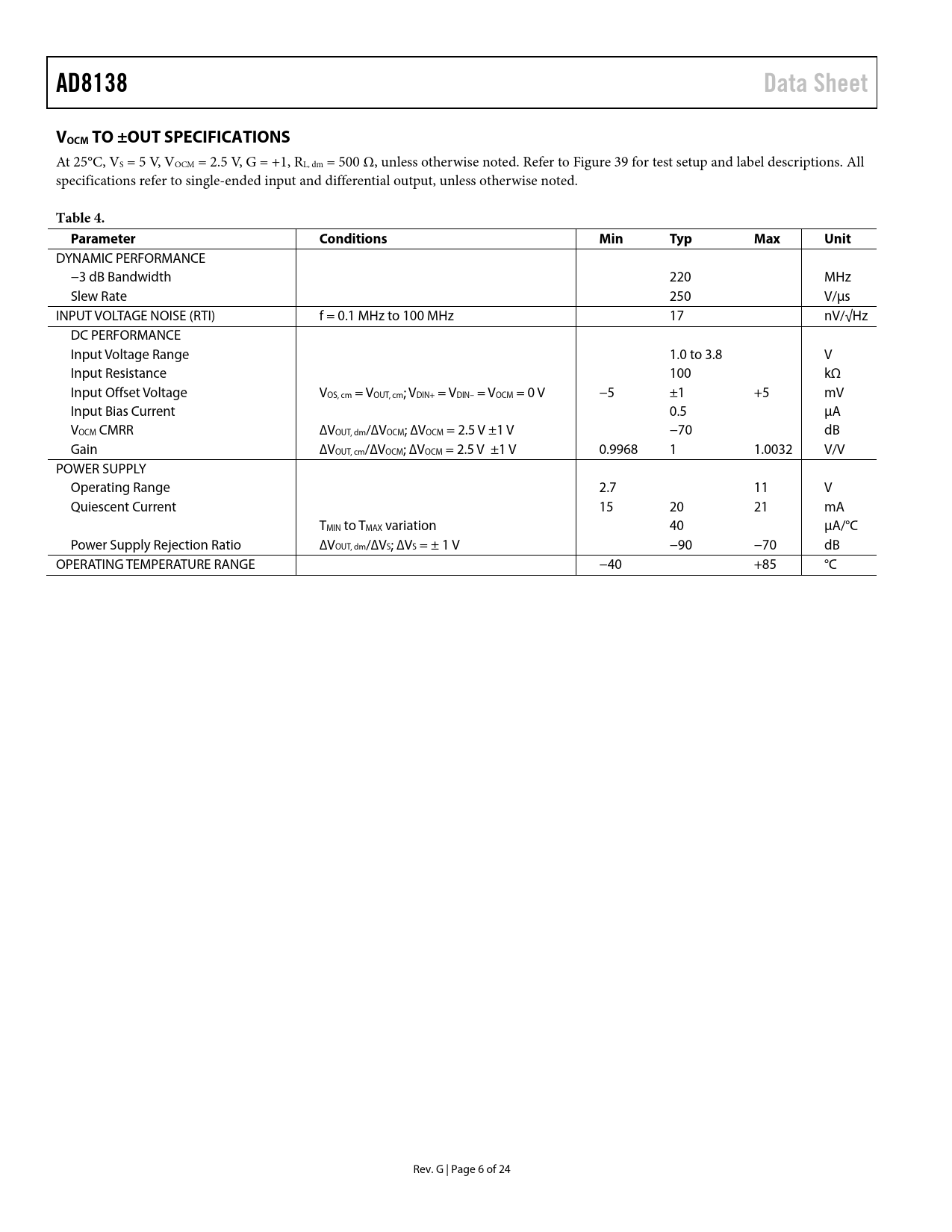 link to page 16 AD8138Data SheetVOCM TO ±OUT SPECIFICATIONS At 25°C, VS = 5 V, VOCM = 2.5 V, G = +1, RL, dm = 500 Ω, unless otherwise noted. Refer to Figure 39 for test setup and label descriptions. All specifications refer to single-ended input and differential output, unless otherwise noted. Table 4.ParameterConditionsMinTypMaxUnit DYNAMIC PERFORMANCE −3 dB Bandwidth 220 MHz Slew Rate 250 V/µs INPUT VOLTAGE NOISE (RTI) f = 0.1 MHz to 100 MHz 17 nV/√Hz DC PERFORMANCE Input Voltage Range 1.0 to 3.8 V Input Resistance 100 kΩ Input Offset Voltage VOS, cm = VOUT, cm; VDIN+ = VDIN– = VOCM = 0 V −5 ±1 +5 mV Input Bias Current 0.5 µA VOCM CMRR ∆VOUT, dm/∆VOCM; ∆VOCM = 2.5 V ±1 V −70 dB Gain ∆VOUT, cm/∆VOCM; ∆VOCM = 2.5 V ±1 V 0.9968 1 1.0032 V/V POWER SUPPLY Operating Range 2.7 11 V Quiescent Current 15 20 21 mA TMIN to TMAX variation 40 µA/°C Power Supply Rejection Ratio ∆VOUT, dm/∆VS; ∆VS = ± 1 V −90 −70 dB OPERATING TEMPERATURE RANGE −40 +85 °C Rev. G | Page 6 of 24 Document Outline FEATURES APPLICATIONS PIN CONFIGURATION TYPICAL APPLICATION CIRCUIT GENERAL DESCRIPTION TABLE OF CONTENTS REVISION HISTORY SPECIFICATIONS ±DIN TO ±OUT SPECIFICATIONS VOCM TO ±OUT SPECIFICATIONS ±DIN TO ±OUT SPECIFICATIONS VOCM TO ±OUT SPECIFICATIONS ABSOLUTE MAXIMUM RATINGS THERMAL RESISTANCE Maximum Power Dissipation ESD CAUTION PIN CONFIGURATION AND FUNCTION DESCRIPTIONS TYPICAL PERFORMANCE CHARACTERISTICS TEST CIRCUITS OPERATIONAL DESCRIPTION DEFINITION OF TERMS THEORY OF OPERATION ANALYZING AN APPLICATION CIRCUIT SETTING THE CLOSED-LOOP GAIN ESTIMATING THE OUTPUT NOISE VOLTAGE THE IMPACT OF MISMATCHES IN THE FEEDBACK NETWORKS CALCULATING THE INPUT IMPEDANCE OF AN APPLICATION INPUT COMMON-MODE VOLTAGE RANGE IN SINGLE-SUPPLY APPLICATIONS SETTING THE OUTPUT COMMON-MODE VOLTAGE DRIVING A CAPACITIVE LOAD LAYOUT, GROUNDING, AND BYPASSING BALANCED TRANSFORMER DRIVER HIGH PERFORMANCE ADC DRIVING 3 V OPERATION OUTLINE DIMENSIONS ORDERING GUIDE