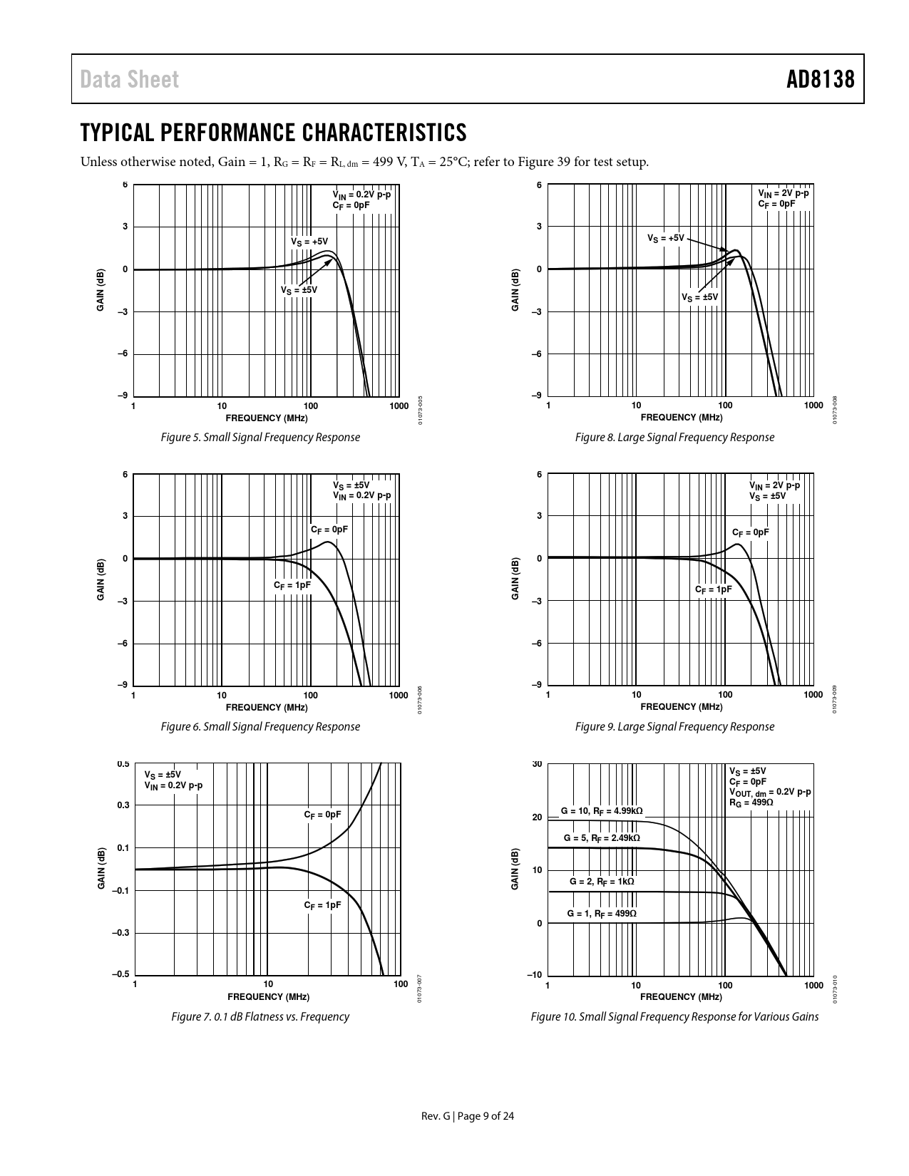 link to page 16 Data SheetAD8138TYPICAL PERFORMANCE CHARACTERISTICS Unless otherwise noted, Gain = 1, RG = RF = RL, dm = 499 V, TA = 25°C; refer to Figure 39 for test setup. 66VVIN = 0.2V p-pIN = 2V p-pCCF = 0pFF = 0pF33VVS = +5VS = +5V00B)B)ddN (VS = ±5VN (VAIAIS = ±5VG–3G–3–6–6–9–91101001000 005 1101001000 008 FREQUENCY (MHz)FREQUENCY (MHz) 01073- 01073- Figure 5. Small Signal Frequency Response Figure 8. Large Signal Frequency Response 66VS = ±5VVIN = 2V p-pVIN = 0.2V p-pVS = ±5V33CF = 0pFCF = 0pF00B)B)ddN (CN (AIF = 1pFAICF = 1pFGG–3–3–6–6–9–91101001000 006 1101001000 009 FREQUENCY (MHz)FREQUENCY (MHz) 01073- 01073- Figure 6. Small Signal Frequency Response Figure 9. Large Signal Frequency Response 0.530VVS = ±5VS = ±5VVCF = 0pFIN = 0.2V p-pVOUT, dm = 0.2V p-p0.3RG = 499ΩCG = 10, RF = 0pF20F = 4.99kΩG = 5, RF = 2.49kΩ0.1B)B)ddN (N (10AIAIG = 2, RGF = 1kΩ–0.1GCF = 1pFG = 1, RF = 499Ω0–0.3–0.5–10110100 007 1101001000 010 FREQUENCY (MHz)FREQUENCY (MHz) 01073- 01073- Figure 7. 0.1 dB Flatness vs. Frequency Figure 10. Small Signal Frequency Response for Various Gains Rev. G | Page 9 of 24 Document Outline FEATURES APPLICATIONS PIN CONFIGURATION TYPICAL APPLICATION CIRCUIT GENERAL DESCRIPTION TABLE OF CONTENTS REVISION HISTORY SPECIFICATIONS ±DIN TO ±OUT SPECIFICATIONS VOCM TO ±OUT SPECIFICATIONS ±DIN TO ±OUT SPECIFICATIONS VOCM TO ±OUT SPECIFICATIONS ABSOLUTE MAXIMUM RATINGS THERMAL RESISTANCE Maximum Power Dissipation ESD CAUTION PIN CONFIGURATION AND FUNCTION DESCRIPTIONS TYPICAL PERFORMANCE CHARACTERISTICS TEST CIRCUITS OPERATIONAL DESCRIPTION DEFINITION OF TERMS THEORY OF OPERATION ANALYZING AN APPLICATION CIRCUIT SETTING THE CLOSED-LOOP GAIN ESTIMATING THE OUTPUT NOISE VOLTAGE THE IMPACT OF MISMATCHES IN THE FEEDBACK NETWORKS CALCULATING THE INPUT IMPEDANCE OF AN APPLICATION INPUT COMMON-MODE VOLTAGE RANGE IN SINGLE-SUPPLY APPLICATIONS SETTING THE OUTPUT COMMON-MODE VOLTAGE DRIVING A CAPACITIVE LOAD LAYOUT, GROUNDING, AND BYPASSING BALANCED TRANSFORMER DRIVER HIGH PERFORMANCE ADC DRIVING 3 V OPERATION OUTLINE DIMENSIONS ORDERING GUIDE