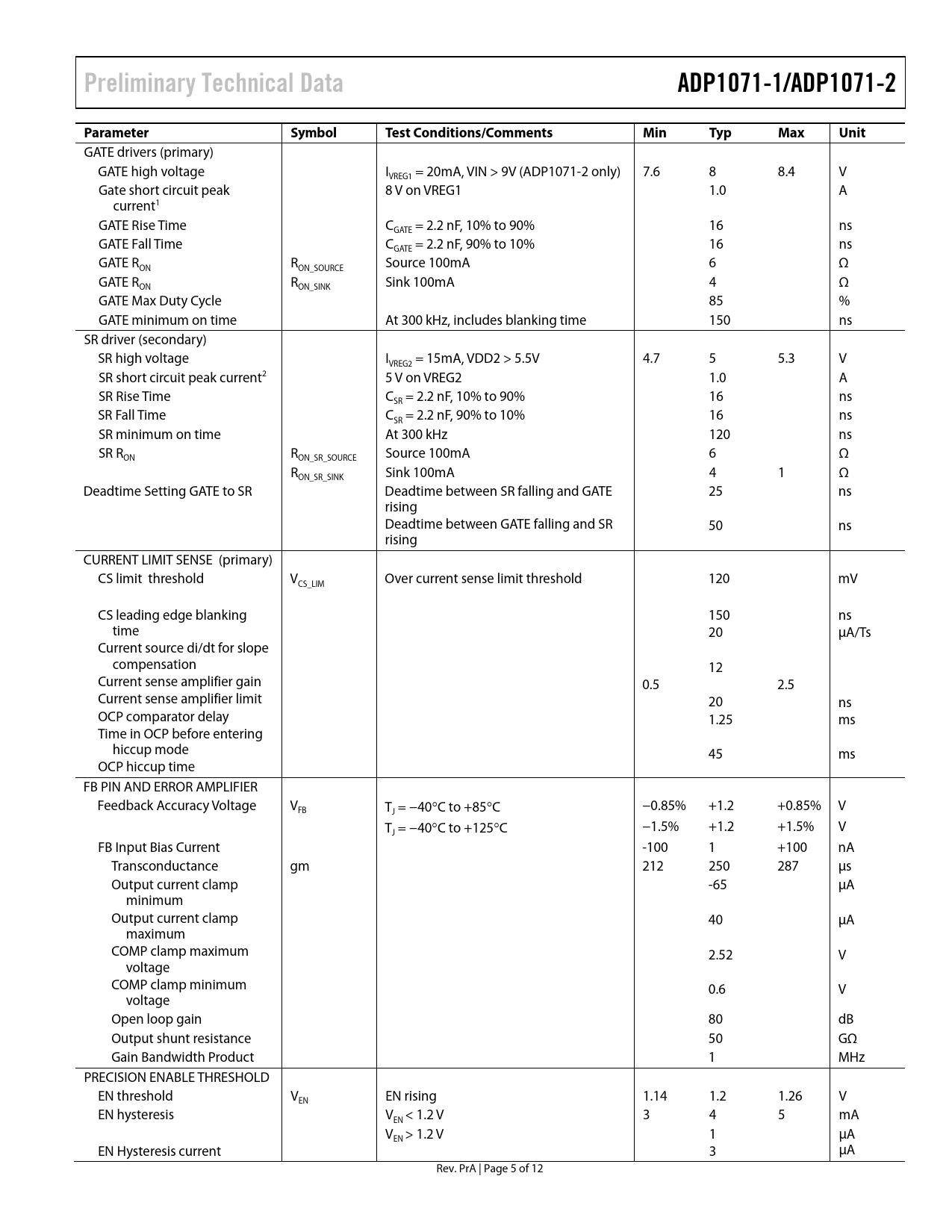 Preliminary Technical DataADP1071-1/ADP1071-2ParameterSymbolTest Conditions/CommentsMinTypMaxUnit GATE drivers (primary) GATE high voltage I = 20mA, VIN > 9V (ADP1071-2 only) 7.6 8 8.4 V VREG1 Gate short circuit peak 8 V on VREG1 1.0 A current1 GATE Rise Time C = 2.2 nF, 10% to 90% 16 ns GATE GATE Fall Time C = 2.2 nF, 90% to 10% 16 ns GATE GATE R R Source 100mA 6 Ω ON ON_SOURCE GATE R R Sink 100mA 4 Ω ON ON_SINK GATE Max Duty Cycle 85 % GATE minimum on time At 300 kHz, includes blanking time 150 ns SR driver (secondary) SR high voltage I = 15mA, VDD2 > 5.5V 4.7 5 5.3 V VREG2 SR short circuit peak current2 5 V on VREG2 1.0 A SR Rise Time C = 2.2 nF, 10% to 90% 16 ns SR SR Fall Time C = 2.2 nF, 90% to 10% 16 ns SR SR minimum on time At 300 kHz 120 ns SR R R Source 100mA 6 Ω ON ON_SR_SOURCE R Sink 100mA 4 1 Ω ON_SR_SINK Deadtime Setting GATE to SR Deadtime between SR falling and GATE 25 ns rising Deadtime between GATE falling and SR 50 ns rising CURRENT LIMIT SENSE (primary) CS limit threshold V Over current sense limit threshold 120 mV CS_LIM CS leading edge blanking 150 ns time 20 µA/Ts Current source di/dt for slope compensation 12 Current sense amplifier gain 0.5 2.5 Current sense amplifier limit 20 ns OCP comparator delay 1.25 ms Time in OCP before entering hiccup mode 45 ms OCP hiccup time FB PIN AND ERROR AMPLIFIER Feedback Accuracy Voltage V FB T = −40°C to +85°C −0.85% +1.2 +0.85% V J T = −40°C to +125°C −1.5% +1.2 +1.5% V J FB Input Bias Current -100 1 +100 nA Transconductance gm 212 250 287 μs Output current clamp -65 μA minimum Output current clamp 40 μA maximum COMP clamp maximum 2.52 V voltage COMP clamp minimum 0.6 V voltage Open loop gain 80 dB Output shunt resistance 50 GΩ Gain Bandwidth Product 1 MHz PRECISION ENABLE THRESHOLD EN threshold V EN rising 1.14 1.2 1.26 V EN EN hysteresis V < 1.2 V 3 4 5 mA EN V > 1.2 V 1 µA EN EN Hysteresis current 3 µA Rev. PrA | Page 5 of 12 Document Outline FEATURES APPLICATIONS GENERAL DESCRIPTION TABLE OF CONTENTS TYPICAL APPLICATION CIRCUITS SPECIFICATIONS REGULATORY INFORMATION ABSOLUTE MAXIMUM RATINGS THERMAL RESISTANCE ESD CAUTION PIN CONFIGURATIONS AND FUNCTION DESCRIPTIONS SIMPLIFIED BLOCK DIAGRAM APPLICATIONS INFORMATION INSULATION LIFETIME OUTLINE DIMENSIONS