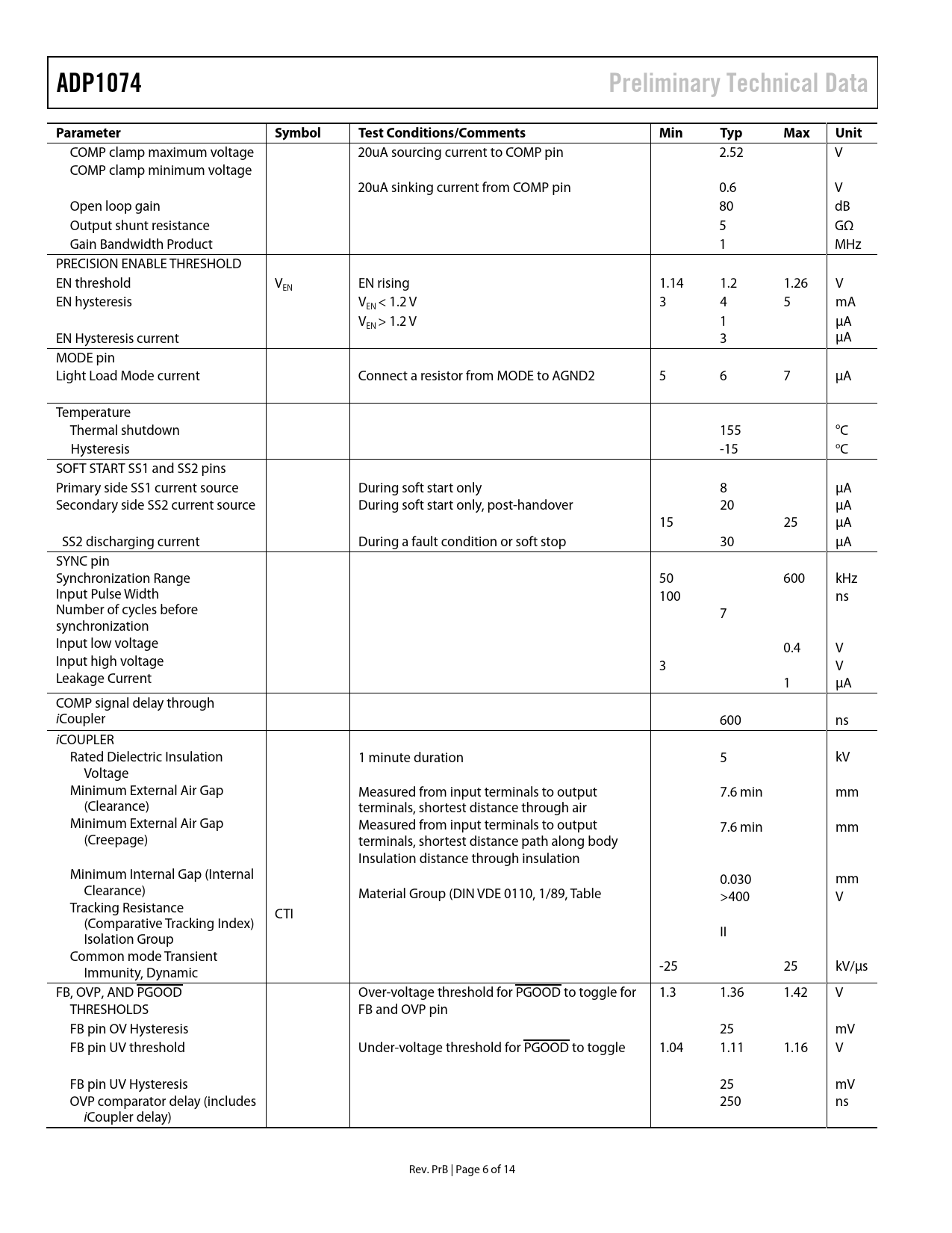 Seiten / Seite14 / 6 — ADP1074. Preliminary Technical Data. Parameter. Symbol. Test …
