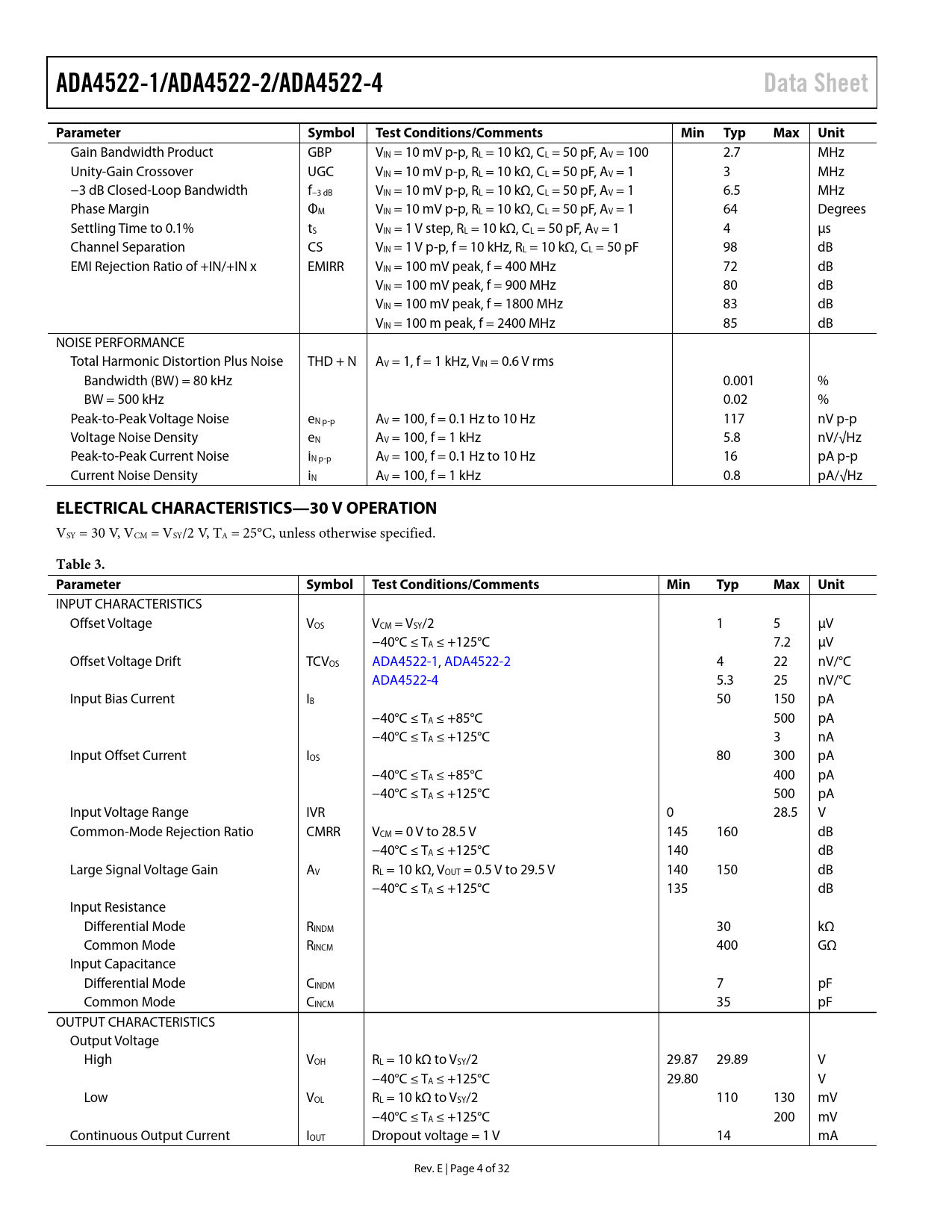INPUT CHARACTERISTICS Offset Voltage VOS VCM = VSY/2 1 5 µV −40°C ≤ TA ≤ +125°C 7.2 µV Offset Voltage Drift TCVOS ADA4522-1, ADA4522-2 4 22 nV/°C ADA4522-4 5.3 25 nV/°C Input Bias Current IB 50 150 pA −40°C ≤ TA ≤ +85°C 500 pA −40°C ≤ TA ≤ +125°C 3 nA Input Offset Current IOS 80 300 pA −40°C ≤ TA ≤ +85°C 400 pA −40°C ≤ TA ≤ +125°C 500 pA Input Voltage Range IVR 0 28.5 V Common-Mode Rejection Ratio CMRR VCM = 0 V to 28.5 V 145 160 dB −40°C ≤ TA ≤ +125°C 140 dB Large Signal Voltage Gain AV RL = 10 kΩ, VOUT = 0.5 V to 29.5 V 140 150 dB −40°C ≤ TA ≤ +125°C 135 dB Input Resistance Differential Mode RINDM 30 kΩ Common Mode RINCM 400 GΩ Input Capacitance Differential Mode CINDM 7 pF Common Mode CINCM 35 pF OUTPUT CHARACTERISTICS Output Voltage High VOH RL = 10 kΩ to VSY/2 29.87 29.89 V −40°C ≤ TA ≤ +125°C 29.80 V Low VOL RL = 10 kΩ to VSY/2 110 130 mV −40°C ≤ TA ≤ +125°C 200 mV Continuous Output Current IOUT Dropout voltage = 1 V 14 mA Rev. E | Page 4 of 32 Document Outline Features Applications General Description Pin Connection Diagram Revision History Specifications Electrical Characteristics—5.0 V Operation Electrical Characteristics—30 V Operation Electrical Characteristics—55 V Operation Absolute Maximum Ratings Thermal Resistance ESD Caution Pin Configurations and Function Descriptions Typical Performance Characteristics Theory of Operation On-Chip Input EMI Filter and Clamp Circuit Thermal Shutdown Input Protection Single-Supply and Rail-to-Rail Output Large Signal Transient Response Case 1 Case 2 Noise Considerations 1/f Noise Source Resistance Residual Ripple Current Noise Density EMI Rejection Ratio Capacitive Load Stability Applications Information Single-Supply Instrumentation Amplifier Load Cell/Strain Gage Sensor Signal Conditioning Using the ADA4522-2 Precision Low-Side Current Shunt Sensor Printed Circuit Board Layout Comparator Operation Outline Dimensions Ordering Guide