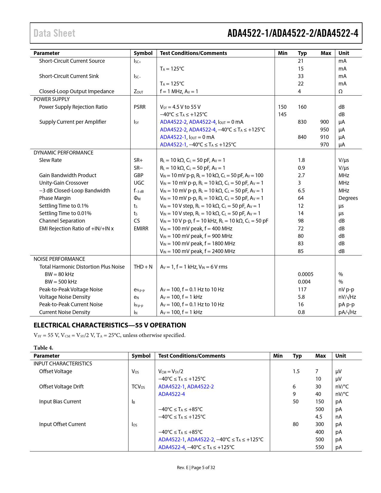 Short-Circuit Current Source ISC+ 21 mA TA = 125°C 15 mA Short-Circuit Current Sink ISC− 33 mA TA = 125°C 22 mA Closed-Loop Output Impedance ZOUT f = 1 MHz, AV = 1 4 Ω POWER SUPPLY Power Supply Rejection Ratio PSRR VSY = 4.5 V to 55 V 150 160 dB −40°C ≤ TA ≤ +125°C 145 dB Supply Current per Amplifier ISY ADA4522-2, ADA4522-4, IOUT = 0 mA 830 900 µA ADA4522-2, ADA4522-4, −40°C ≤ TA ≤ +125°C 950 µA ADA4522-1, IOUT = 0 mA 840 910 µA ADA4522-1, −40°C ≤ TA ≤ +125°C 970 µA DYNAMIC PERFORMANCE Slew Rate SR+ RL = 10 kΩ, CL = 50 pF, AV = 1 1.8 V/µs SR− RL = 10 kΩ, CL = 50 pF, AV = 1 0.9 V/µs Gain Bandwidth Product GBP VIN = 10 mV p-p, RL = 10 kΩ, CL = 50 pF, AV = 100 2.7 MHz Unity-Gain Crossover UGC VIN = 10 mV p-p, RL = 10 kΩ, CL = 50 pF, AV = 1 3 MHz −3 dB Closed-Loop Bandwidth f−3 dB VIN = 10 mV p-p, RL = 10 kΩ, CL = 50 pF, AV = 1 6.5 MHz Phase Margin ΦM VIN = 10 mV p-p, RL = 10 kΩ, CL = 50 pF, AV = 1 64 Degrees Settling Time to 0.1% tS VIN = 10 V step, RL = 10 kΩ, CL = 50 pF, AV = 1 12 µs Settling Time to 0.01% tS VIN = 10 V step, RL = 10 kΩ, CL = 50 pF, AV = 1 14 µs Channel Separation CS VIN = 10 V p-p, f = 10 kHz, RL = 10 kΩ, CL = 50 pF 98 dB EMI Rejection Ratio of +IN/+IN x EMIRR VIN = 100 mV peak, f = 400 MHz 72 dB VIN = 100 mV peak, f = 900 MHz 80 dB VIN = 100 mV peak, f = 1800 MHz 83 dB VIN = 100 mV peak, f = 2400 MHz 85 dB NOISE PERFORMANCE Total Harmonic Distortion Plus Noise THD + N AV = 1, f = 1 kHz, VIN = 6 V rms BW = 80 kHz 0.0005 % BW = 500 kHz 0.004 % Peak-to-Peak Voltage Noise eN p-p AV = 100, f = 0.1 Hz to 10 Hz 117 nV p-p Voltage Noise Density eN AV = 100, f = 1 kHz 5.8 nV/√Hz Peak-to-Peak Current Noise iN p-p AV = 100, f = 0.1 Hz to 10 Hz 16 pA p-p Current Noise Density iN AV = 100, f = 1 kHz 0.8 pA/√Hz