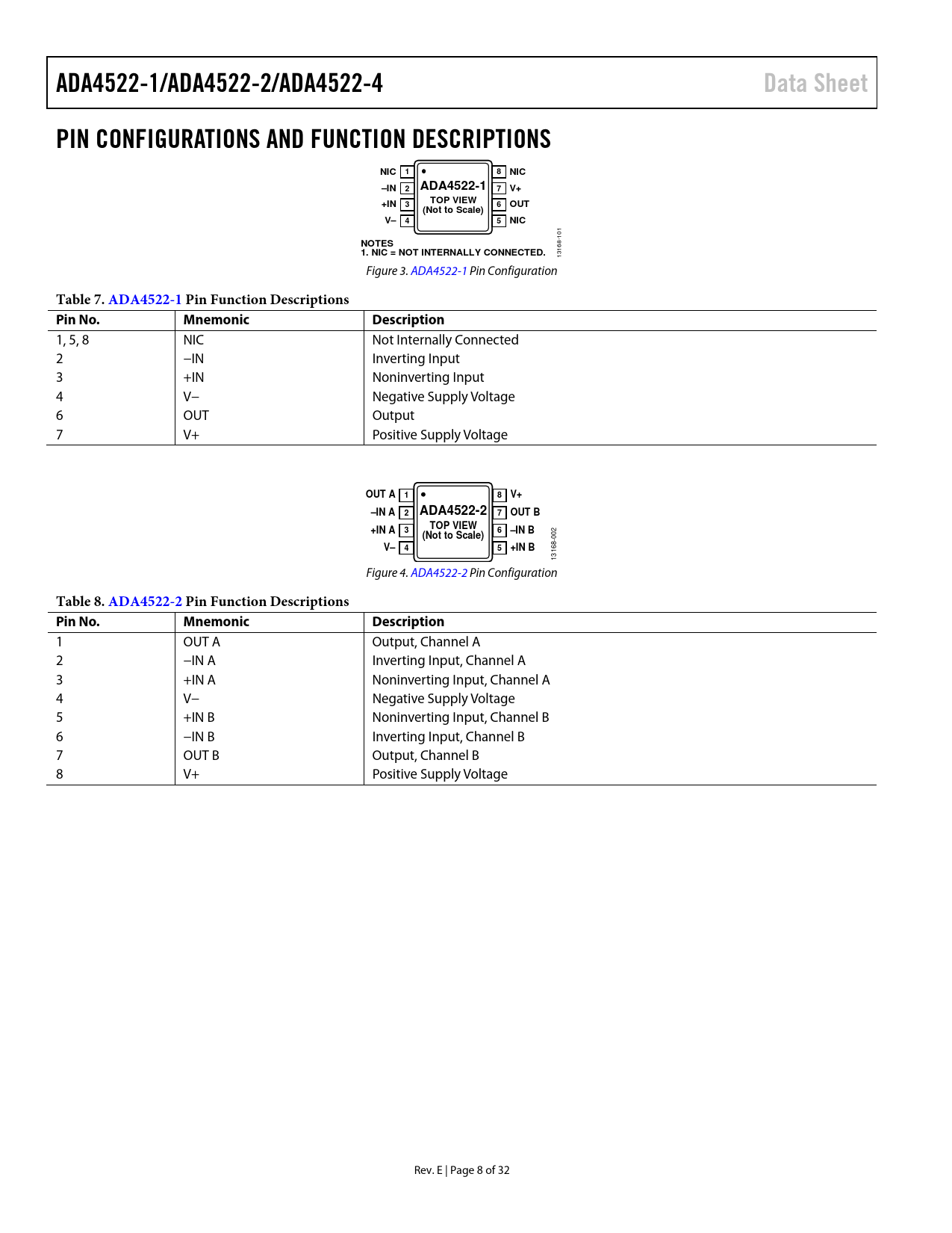 ADA4522-1/ADA4522-2/ADA4522-4. Data Sheet. PIN CONFIGURATIONS AND FUNCTION DESCRIPTIONS. NIC. –IN. ADA4522-1 7 V+. +IN. TOP VIEW. OUT