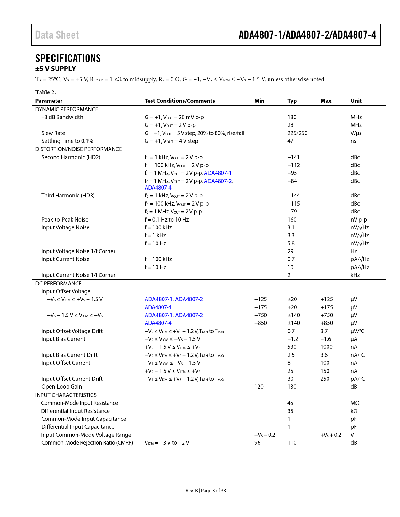 | Seiten / Seite | 33 / 3 — Data Sheet. ADA4807-1/ADA4807-2/ADA4807-4. SPECIFICATIONS ±5 V SUPPLY. … |