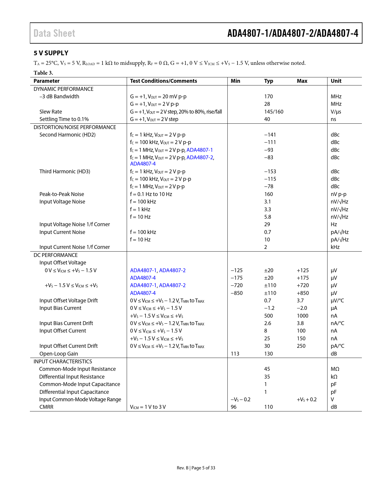 | Seiten / Seite | 33 / 5 — Data Sheet. ADA4807-1/ADA4807-2/ADA4807-4. 5 V SUPPLY. Table 3. Parameter … |