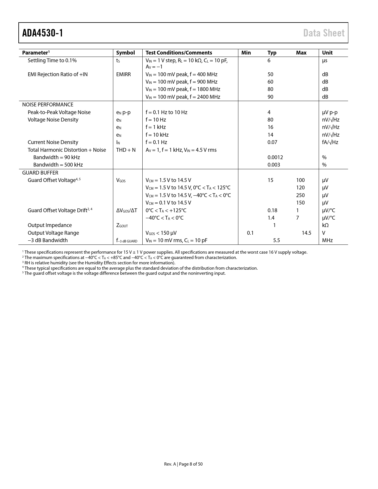 ADA4530-1. Data Sheet. Parameter1. Symbol. Test Conditions/Comments. Min. Typ. Max. Unit