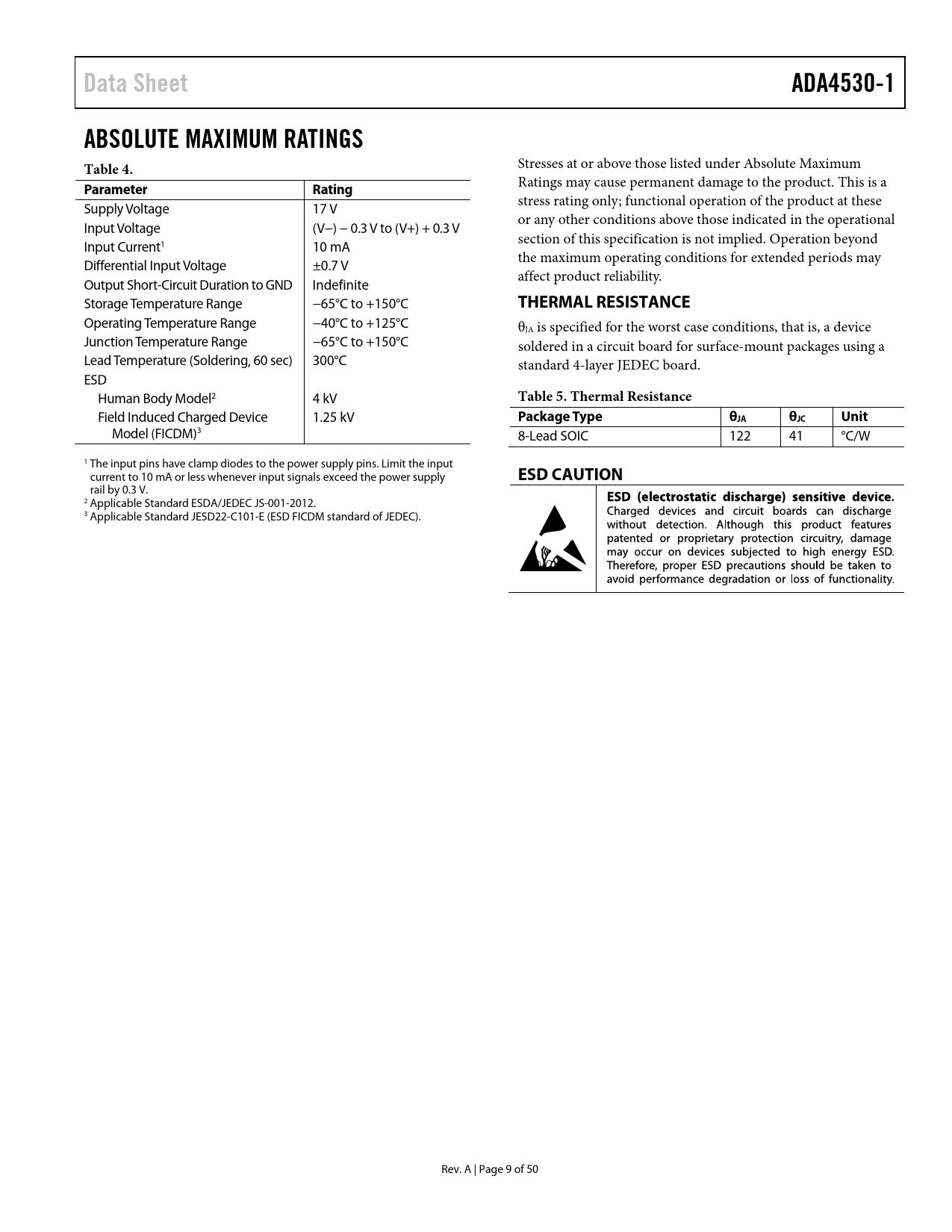 Data SheetADA4530-1ABSOLUTE MAXIMUM RATINGS Table 4. Stresses at or above those listed under Absolute Maximum Ratings may cause permanent damage to the product. This is a Parameter Rating stress rating only; functional operation of the product at these Supply Voltage 17 V or any other conditions above those indicated in the operational Input Voltage (V−) − 0.3 V to (V+) + 0.3 V section of this specification is not implied. Operation beyond Input Current1 10 mA the maximum operating conditions for extended periods may Differential Input Voltage ±0.7 V affect product reliability. Output Short-Circuit Duration to GND Indefinite Storage Temperature Range −65°C to +150°C THERMAL RESISTANCE Operating Temperature Range −40°C to +125°C θJA is specified for the worst case conditions, that is, a device Junction Temperature Range −65°C to +150°C soldered in a circuit board for surface-mount packages using a Lead Temperature (Soldering, 60 sec) 300°C standard 4-layer JEDEC board. ESD Human Body Model2 4 kV Table 5. Thermal Resistance Field Induced Charged Device 1.25 kV Package TypeθJAθJC Unit Model (FICDM)3 8-Lead SOIC 122 41 °C/W 1 The input pins have clamp diodes to the power supply pins. Limit the input current to 10 mA or less whenever input signals exceed the power supply ESD CAUTION rail by 0.3 V. 2 Applicable Standard ESDA/JEDEC JS-001-2012. 3 Applicable Standard JESD22-C101-E (ESD FICDM standard of JEDEC). Rev. A | Page 9 of 50 Document Outline FEATURES APPLICATIONS PIN CONNECTION DIAGRAM GENERAL DESCRIPTION TABLE OF CONTENTS REVISION HISTORY SPECIFICATIONS 5 V NOMINAL ELECTRICAL CHARACTERISTICS 10 V NOMINAL ELECTRICAL CHARACTERISTICS 15 V NOMINAL ELECTRICAL CHARACTERISTICS ABSOLUTE MAXIMUM RATINGS THERMAL RESISTANCE ESD CAUTION PIN CONFIGURATION AND FUNCTION DESCRIPTIONS TYPICAL PERFORMANCE CHARACTERISTICS MAIN AMPLIFIER, DC PERFORMANCE MAIN AMPLIFIER, AC PERFORMANCE GUARD AMPLIFIER THEORY OF OPERATION ESD STRUCTURE INPUT STAGE GAIN STAGE OUTPUT STAGE GUARD BUFFER APPLICATIONS INFORMATION INPUT PROTECTION SINGLE-SUPPLY AND RAIL-TO-RAIL OUTPUT CAPACITIVE LOAD STABILITY EMI REJECTION RATIO HIGH IMPEDANCE MEASUREMENTS INPUT BIAS CURRENT INPUT RESISTANCE INPUT OFFSET VOLTAGE INSULATION RESISTANCE GUARDING DIELECTRIC RELAXATION HUMIDITY EFFECTS CONTAMINATION CLEANING AND HANDLING SOLDER PASTE SELECTION CURRENT NOISE CONSIDERATIONS LAYOUT GUIDELINES PHYSICAL IMPLEMENTATION OF GUARDING TECHNIQUES GUARD RING GUARD PLANE VIA FENCE CABLES AND CONNECTORS ELECTROSTATIC INTERFERANCE PHOTODIODE INTERFACE DC ERROR ANALYSIS AC ERROR ANALYSIS NOISE ANALYSIS DESIGN RECOMMENDATIONS DESIGN EXAMPLE POWER SUPPLY RECOMMENDATIONS POWER SUPPLY CONSIDERATIONS OUTLINE DIMENSIONS ORDERING GUIDE