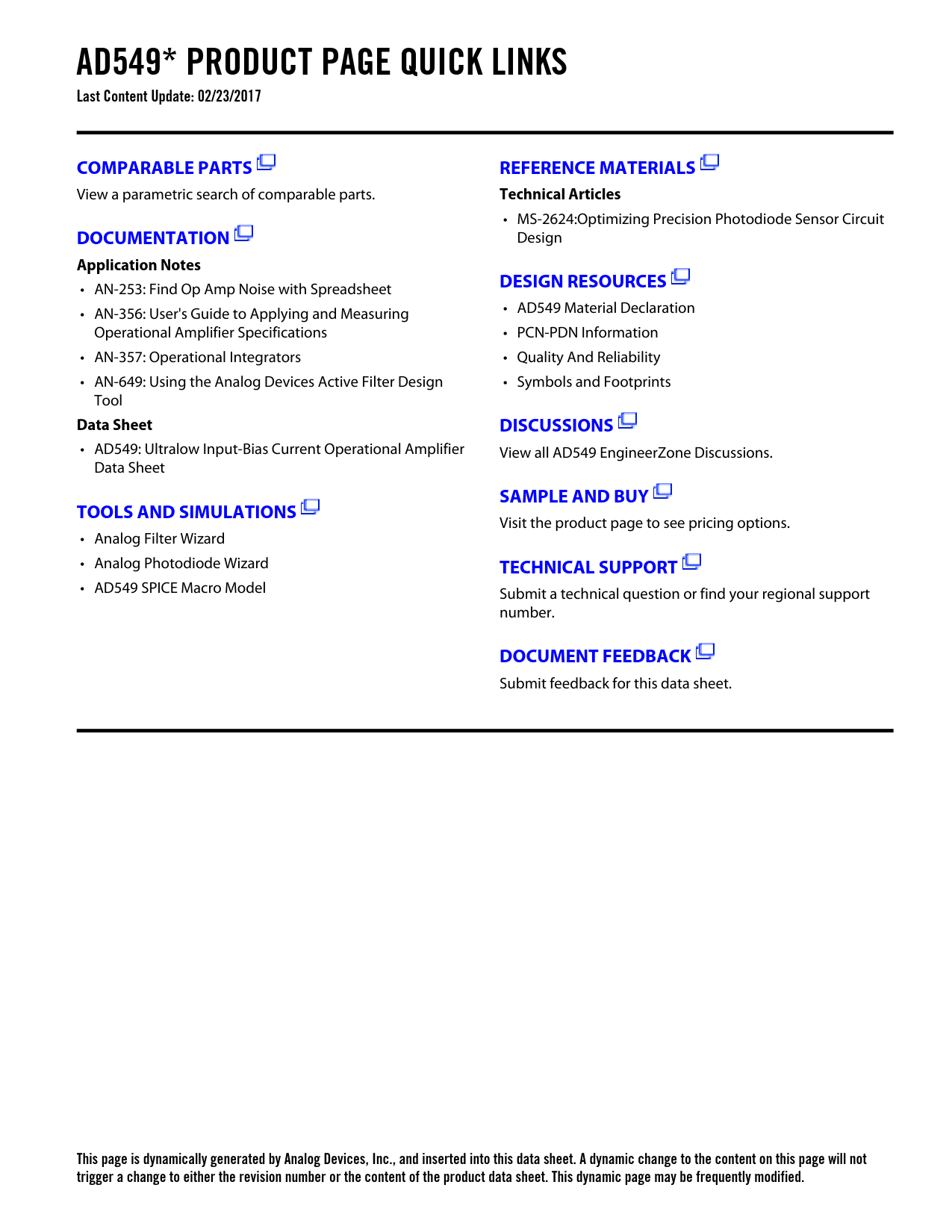 AD549* PRODUCT PAGE QUICK LINKS Last Content Update: 02/23/2017COMPARABLE PARTSREFERENCE MATERIALS View a parametric search of comparable parts. Technical Articles • MS-2624:Optimizing Precision Photodiode Sensor Circuit DOCUMENTATION Design Application Notes • AN-253: Find Op Amp Noise with Spreadsheet DESIGN RESOURCES • AN-356: User's Guide to Applying and Measuring • AD549 Material Declaration Operational Amplifier Specifications • PCN-PDN Information • AN-357: Operational Integrators • Quality And Reliability • AN-649: Using the Analog Devices Active Filter Design • Symbols and Footprints Tool Data SheetDISCUSSIONS • AD549: Ultralow Input-Bias Current Operational Amplifier View all AD549 EngineerZone Discussions. Data Sheet SAMPLE AND BUYTOOLS AND SIMULATIONS Visit the product page to see pricing options. • Analog Filter Wizard • Analog Photodiode Wizard TECHNICAL SUPPORT • AD549 SPICE Macro Model Submit a technical question or find your regional support number. DOCUMENT FEEDBACK Submit feedback for this data sheet. This page is dynamically generated by Analog Devices, Inc., and inserted into this data sheet. A dynamic change to the content on this page will not trigger a change to either the revision number or the content of the product data sheet. This dynamic page may be frequently modified. Document Outline FEATURES APPLICATIONS CONNECTION DIAGRAM GENERAL DESCRIPTION PRODUCT HIGHLIGHTS TABLE OF CONTENTS REVISION HISTORY SPECIFICATIONS ABSOLUTE MAXIMUM RATINGS ESD CAUTION TYPICAL PERFORMANCE CHARACTERISTICS FUNCTIONAL DESCRIPTION MINIMIZING INPUT CURRENT CIRCUIT BOARD NOTES OFFSET NULLING AC RESPONSE WITH HIGH VALUE SOURCE AND FEEDBACK RESISTANCE COMMON-MODE INPUT VOLTAGE OVERLOAD DIFFERENTIAL INPUT VOLTAGE OVERLOAD INPUT PROTECTION SAMPLE-AND-DIFFERENCE CIRCUIT TO MEASURE ELECTROMETER LEAKAGE CURRENTS PHOTODIODE INTERFACE Photodiode Preamp Noise LOG RATIO AMPLIFIER TEMPERATURE COMPENSATED pH PROBE AMPLIFIER OUTLINE DIMENSIONS ORDERING GUIDE