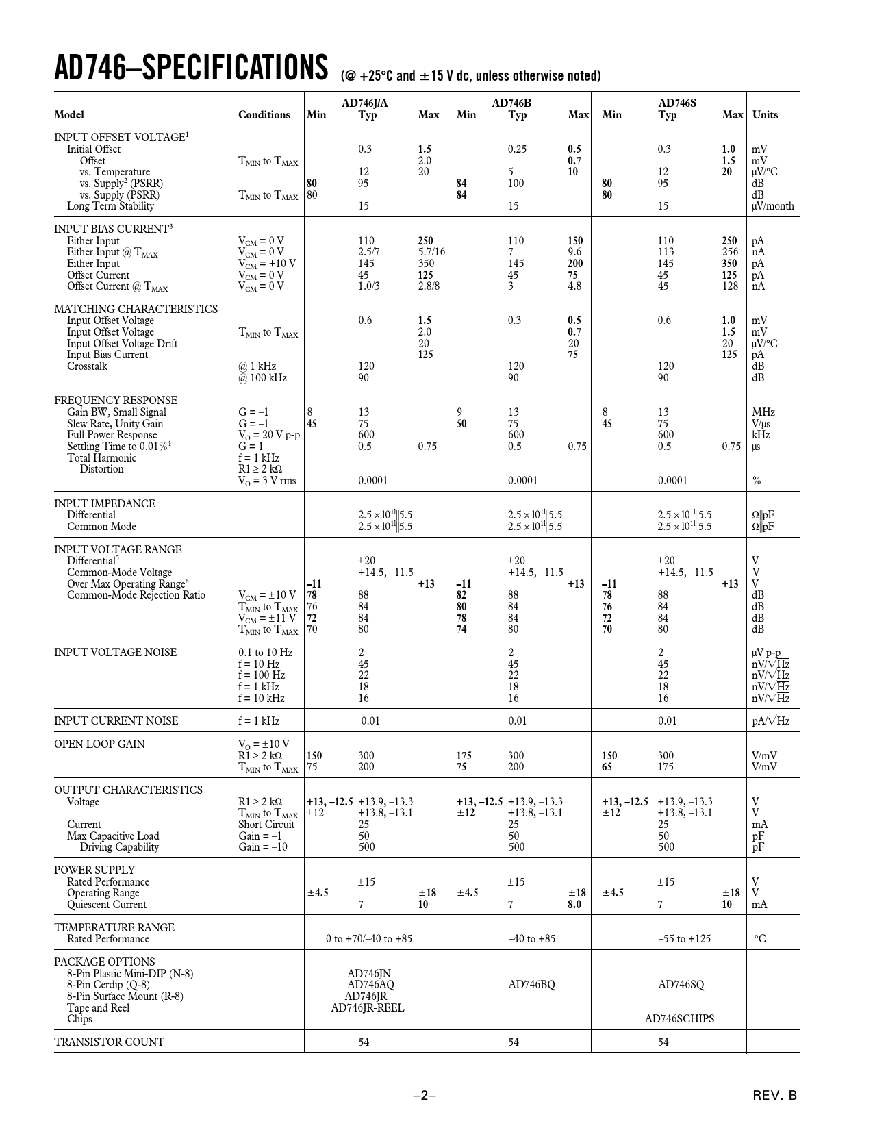 AD746–SPECIFICATIONS (@ +25. C and. 15 V dc, unless otherwise noted). AD746J/A. AD746B. AD746S. Model. Conditions. Min. Typ. Max. Max Units