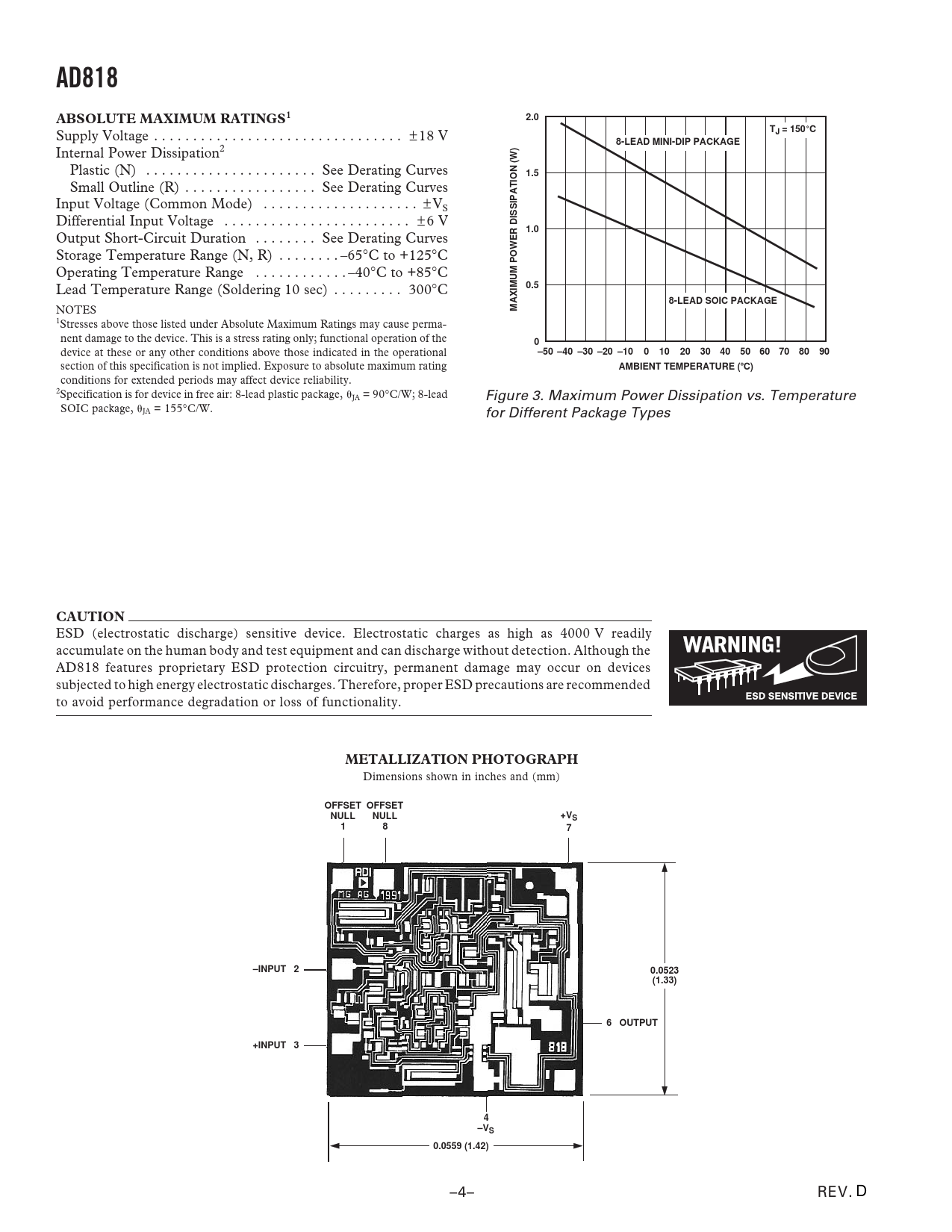 AD818ABSOLUTE MAXIMUM RATINGS12.0T Supply Voltage . ± 18 V J = 150 C8-LEAD MINI-DIP PACKAGE Internal Power Dissipation2 Plastic (N) . See Derating Curves 1.5 Small Outline (R) . See Derating Curves Input Voltage (Common Mode) . ± VS Differential Input Voltage . ± 6 V 1.0 Output Short-Circuit Duration . See Derating Curves Storage Temperature Range (N, R) . –65∞C to +125∞C Operating Temperature Range . –40∞C to +85∞C Lead Temperature Range (Soldering 10 sec) . 300∞C 0.58-LEAD SOIC PACKAGE NOTES MAXIMUM POWER DISSIPATION (W) 1Stresses above those listed under Absolute Maximum Ratings may cause perma- nent damage to the device. This is a stress rating only; functional operation of the 0 device at these or any other conditions above those indicated in the operational –50 –40 –30 –20 –100102030405060708090 section of this specification is not implied. Exposure to absolute maximum rating AMBIENT TEMPERATURE ( ⴗ C) conditions for extended periods may affect device reliability. 2Specification is for device in free air: 8-lead plastic package, JA = 90∞C/W; 8-lead Figure 3. Maximum Power Dissipation vs. Temperature SOIC package, JA = 155∞C/W. for Different Package Types CAUTION ESD (electrostatic discharge) sensitive device. Electrostatic charges as high as 4000 V readily accumulate on the human body and test equipment and can discharge without detection. Although the AD818 features proprietary ESD protection circuitry, permanent damage may occur on devices subjected to high energy electrostatic discharges. Therefore, proper ESD precautions are recommended to avoid performance degradation or loss of functionality. METALLIZATION PHOTOGRAPH Dimensions shown in inches and (mm) OFFSET OFFSETNULLNULL+VS187–INPUT 20.0523(1.33)6 OUTPUT+INPUT 34–VS0.0559 (1.42) –4– REV. D Document Outline Untitled