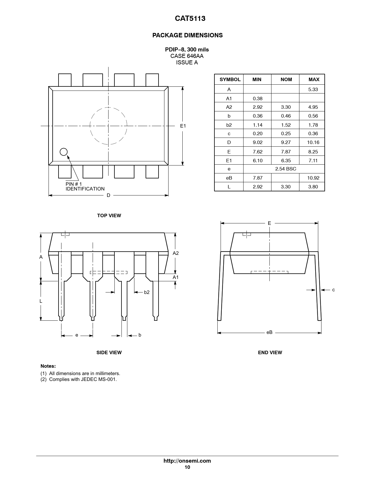 CAT5113PACKAGE DIMENSIONSPDIP−8, 300 mils CASE 646AA ISSUE A SYMBOLMINNOMMAX A 5.33 A1 0.38 A2 2.92 3.30 4.95 b 0.36 0.46 0.56 E1 b2 1.14 1.52 1.78 c 0.20 0.25 0.36 D 9.02 9.27 10.16 E 7.62 7.87 8.25 E1 6.10 6.35 7.11 e 2.54 BSC eB 7.87 10.92 PIN # 1 L 2.92 3.30 3.80 IDENTIFICATION D TOP VIEW E A2 A A1 c b2 L eB e b SIDE VIEWEND VIEWNotes: (1) All dimensions are in millimeters. (2) Complies with JEDEC MS-001. http://onsemi.com10