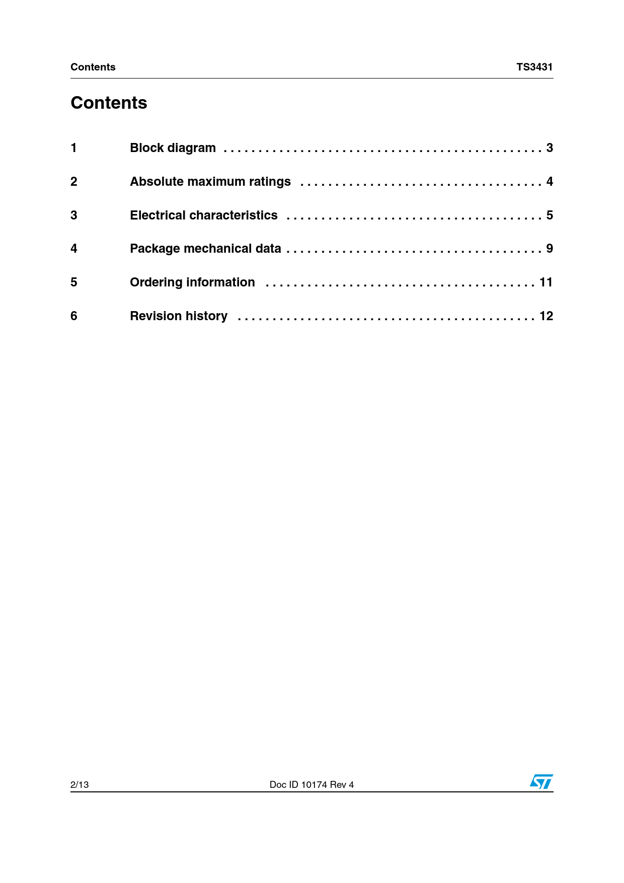 Contents. TS3431. Block diagram . 3. Absolute maximum ratings . 4. Electrical characteristics . 5. Package mechanical data . 9