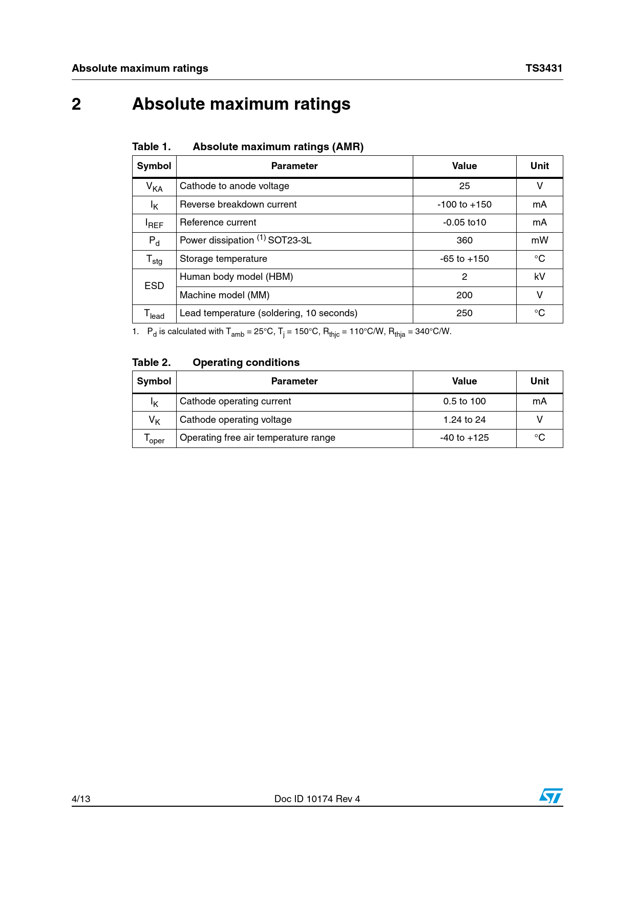 Absolute maximum ratings. TS3431. Table 1. Absolute maximum ratings (AMR). Symbol. Parameter. Value. Unit. Table 2. Operating conditions