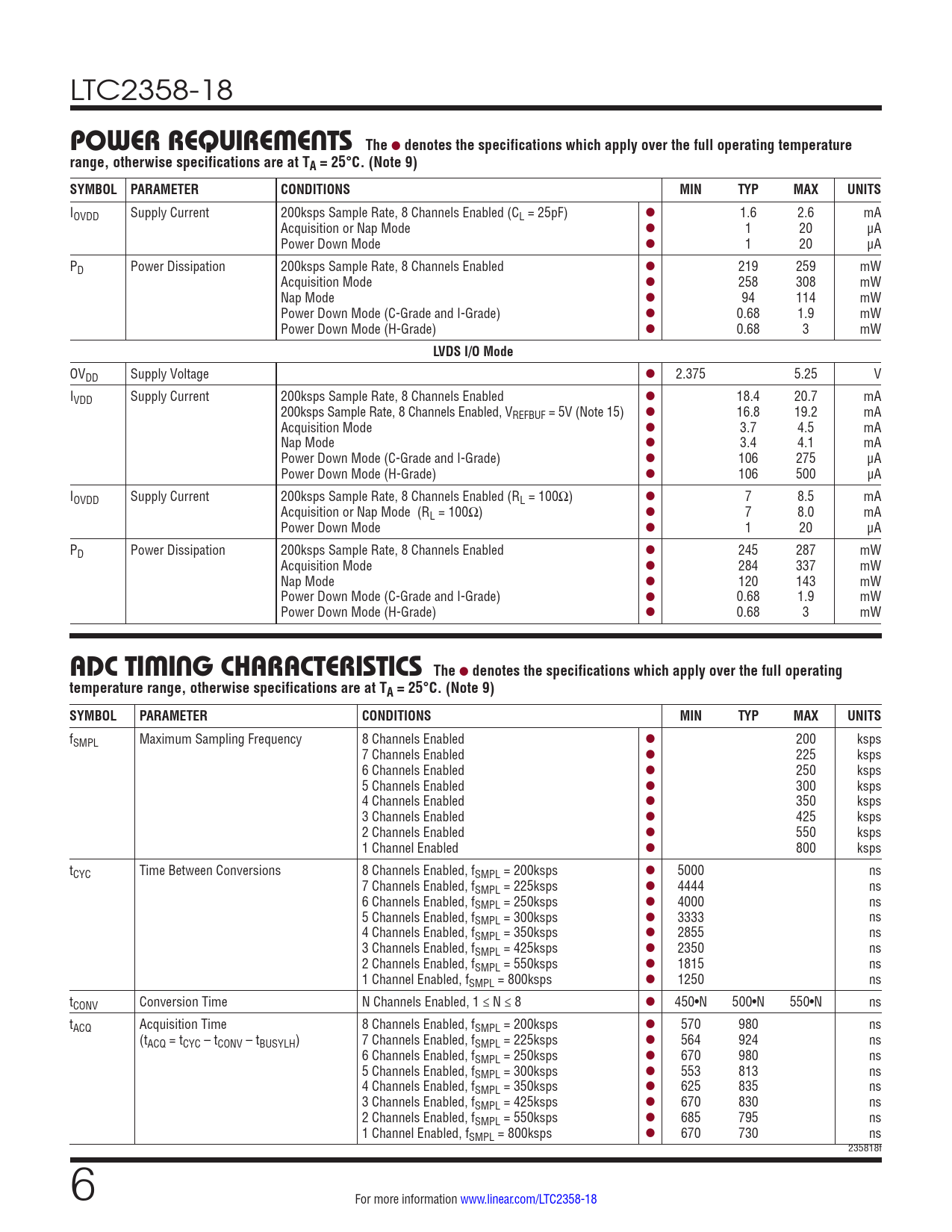 LTC2358-18 POWER REQUIREMENTS The l denotes the specifications which apply over the full operating temperaturerange, otherwise specifications are at TA = 25°C. (Note 9) SYMBOL PARAMETERCONDITIONSMINTYPMAXUNITS IOVDD Supply Current 200ksps Sample Rate, 8 Channels Enabled (CL = 25pF) l 1.6 2.6 mA Acquisition or Nap Mode l 1 20 μA Power Down Mode l 1 20 μA PD Power Dissipation 200ksps Sample Rate, 8 Channels Enabled l 219 259 mW Acquisition Mode l 258 308 mW Nap Mode l 94 114 mW Power Down Mode (C-Grade and I-Grade) l 0.68 1.9 mW Power Down Mode (H-Grade) l 0.68 3 mW LVDS I/O Mode OVDD Supply Voltage l 2.375 5.25 V IVDD Supply Current 200ksps Sample Rate, 8 Channels Enabled l 18.4 20.7 mA 200ksps Sample Rate, 8 Channels Enabled, VREFBUF = 5V (Note 15) l 16.8 19.2 mA Acquisition Mode l 3.7 4.5 mA Nap Mode l 3.4 4.1 mA Power Down Mode (C-Grade and I-Grade) l 106 275 μA Power Down Mode (H-Grade) l 106 500 µA IOVDD Supply Current 200ksps Sample Rate, 8 Channels Enabled (RL = 100Ω) l 7 8.5 mA Acquisition or Nap Mode (RL = 100Ω) l 7 8.0 mA Power Down Mode l 1 20 μA PD Power Dissipation 200ksps Sample Rate, 8 Channels Enabled l 245 287 mW Acquisition Mode l 284 337 mW Nap Mode l 120 143 mW Power Down Mode (C-Grade and I-Grade) l 0.68 1.9 mW Power Down Mode (H-Grade) l 0.68 3 mW ADC TIMING CHARACTERISTICS The l denotes the specifications which apply over the full operatingtemperature range, otherwise specifications are at TA = 25°C. (Note 9) SYMBOLPARAMETERCONDITIONSMINTYPMAXUNITS fSMPL Maximum Sampling Frequency 8 Channels Enabled l 200 ksps 7 Channels Enabled l 225 ksps 6 Channels Enabled l 250 ksps 5 Channels Enabled l 300 ksps 4 Channels Enabled l 350 ksps 3 Channels Enabled l 425 ksps 2 Channels Enabled l 550 ksps 1 Channel Enabled l 800 ksps tCYC Time Between Conversions 8 Channels Enabled, fSMPL = 200ksps l 5000 ns 7 Channels Enabled, fSMPL = 225ksps l 4444 ns 6 Channels Enabled, fSMPL = 250ksps l 4000 ns 5 Channels Enabled, fSMPL = 300ksps l 3333 ns 4 Channels Enabled, fSMPL = 350ksps l 2855 ns 3 Channels Enabled, fSMPL = 425ksps l 2350 ns 2 Channels Enabled, fSMPL = 550ksps l 1815 ns 1 Channel Enabled, fSMPL = 800ksps l 1250 ns tCONV Conversion Time N Channels Enabled, 1 ≤ N ≤ 8 l 450•N 500•N 550•N ns tACQ Acquisition Time 8 Channels Enabled, fSMPL = 200ksps l 570 980 ns (tACQ = tCYC – tCONV – tBUSYLH) 7 Channels Enabled, fSMPL = 225ksps l 564 924 ns 6 Channels Enabled, fSMPL = 250ksps l 670 980 ns 5 Channels Enabled, fSMPL = 300ksps l 553 813 ns 4 Channels Enabled, fSMPL = 350ksps l 625 835 ns 3 Channels Enabled, fSMPL = 425ksps l 670 830 ns 2 Channels Enabled, fSMPL = 550ksps l 685 795 ns 1 Channel Enabled, fSMPL = 800ksps l 670 730 ns 235818f 6 For more information www.linear.com/LTC2358-18 Document Outline Features Applications Typical Application Description Absolute Maximum Ratings Order Information Pin Configuration Electrical Characteristics Converter Characteristics Dynamic Accuracy Internal Reference Characteristics Reference Buffer Characteristics Digital Inputs and Digital Outputs Power Requirements ADC Timing Characteristics Typical Performance Characteristics Pin Functions Configuration Tables Functional Block Diagram Timing Diagram Applications Information Board Layout Package Description Typical Application Related Parts