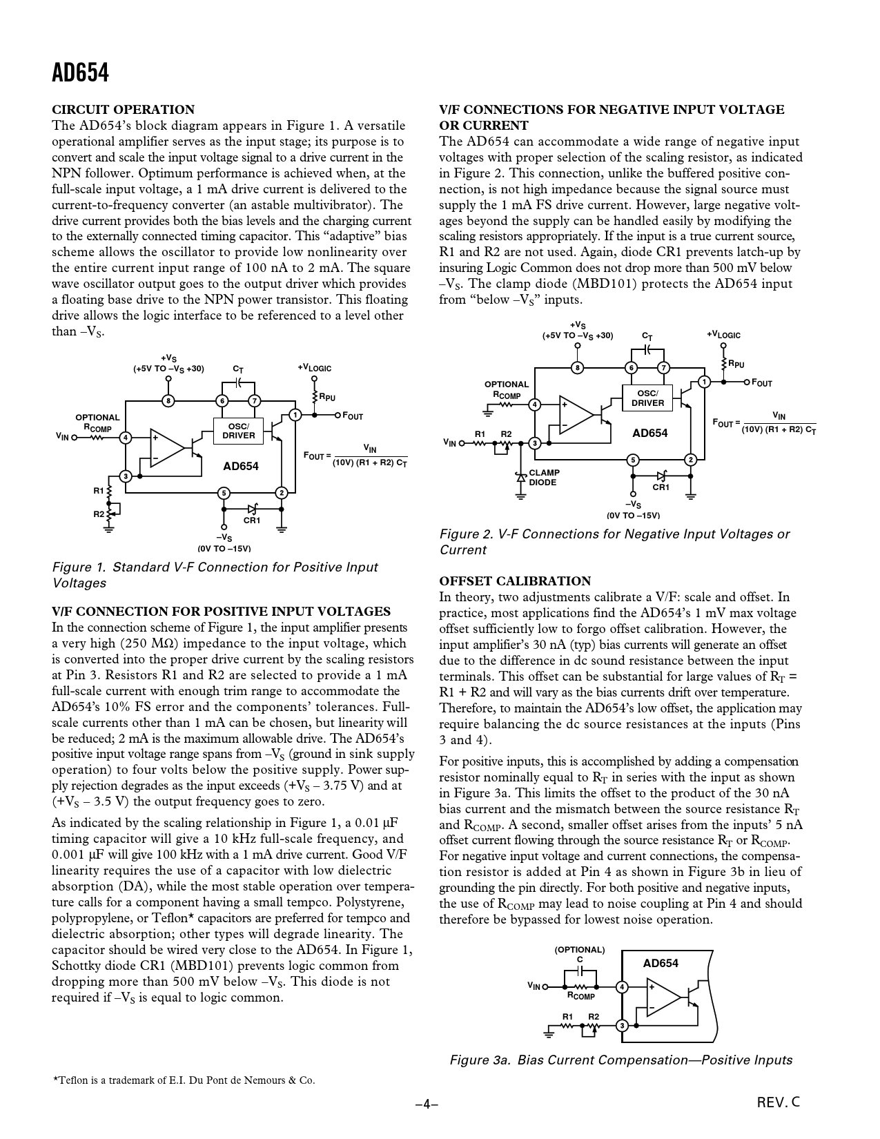 AD654 CIRCUIT OPERATION V/F CONNECTIONS FOR NEGATIVE INPUT VOLTAGE OR CURRENT (+5V TO –V S +30) LOGIC +VS OPTIONAL FOUT OSC/ COMP
