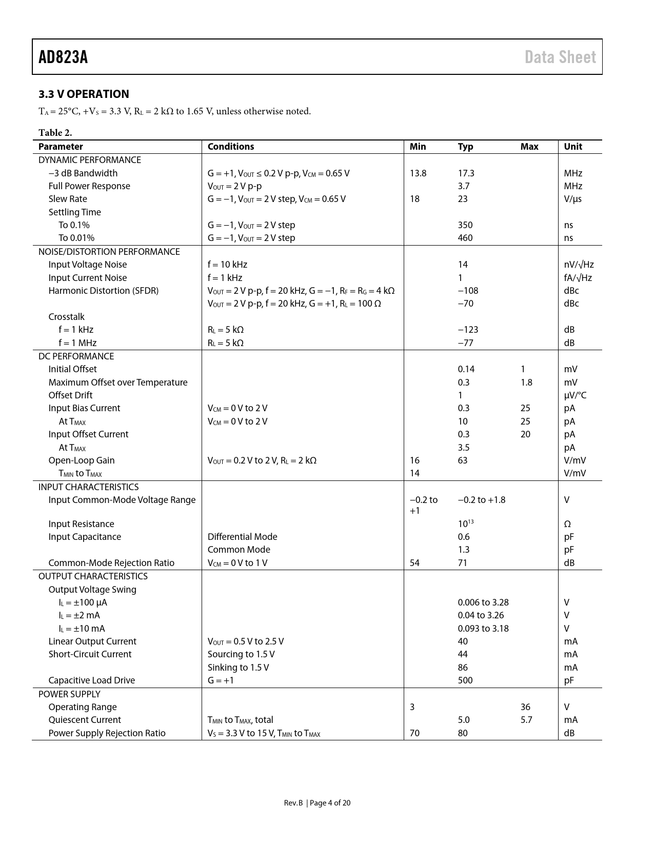 AD823A. Data Sheet. 3.3 V OPERATION. Table 2. Parameter. Conditions. Min. Typ. Max. Unit