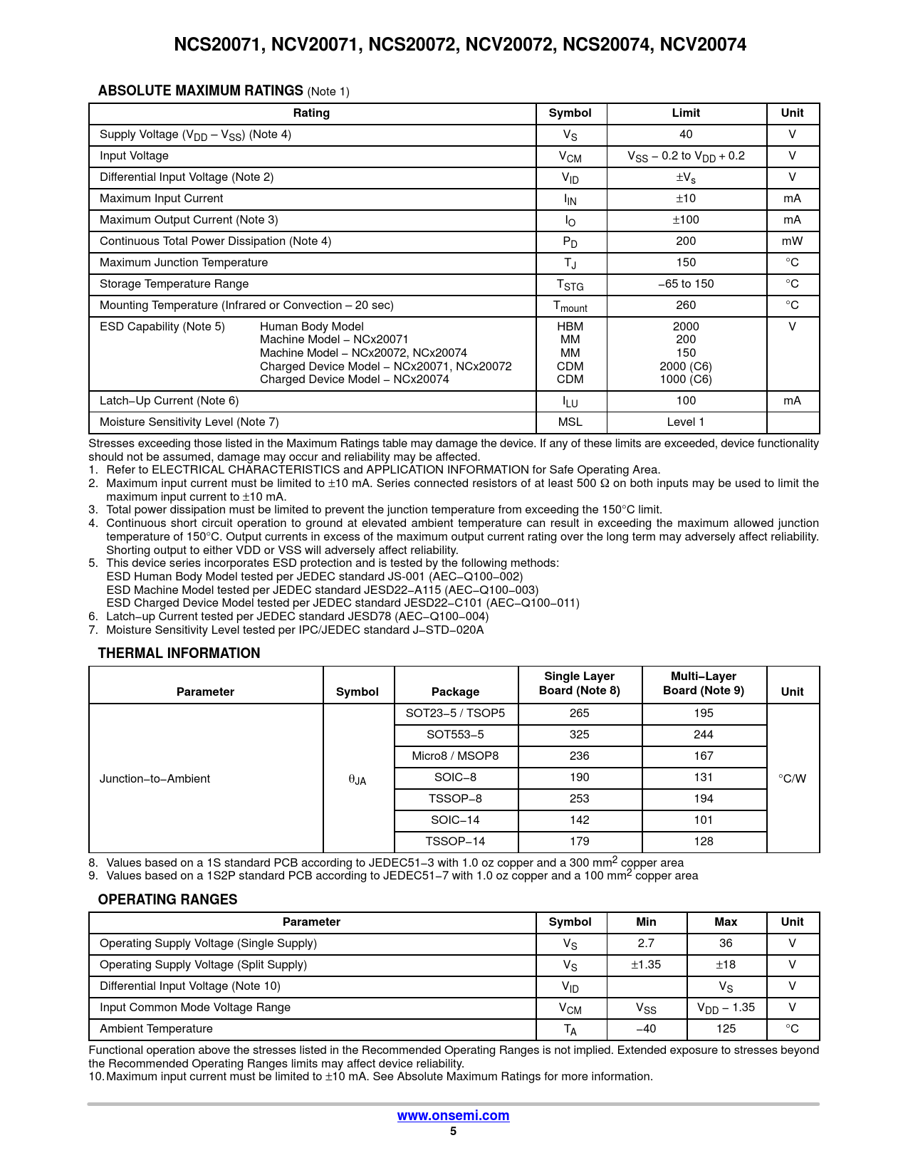 link to page 5 link to page 5 link to page 5 link to page 5 link to page 5 link to page 5 link to page 5 link to page 5 link to page 5 link to page 5 link to page 5 NCS20071, NCV20071, NCS20072, NCV20072, NCS20074, NCV20074ABSOLUTE MAXIMUM RATINGS (Note 1) RatingSymbolLimitUnit Supply Voltage (VDD – VSS) (Note 4) VS 40 V Input Voltage VCM VSS − 0.2 to VDD + 0.2 V Differential Input Voltage (Note 2) VID ±Vs V Maximum Input Current IIN ±10 mA Maximum Output Current (Note 3) IO ±100 mA Continuous Total Power Dissipation (Note 4) PD 200 mW Maximum Junction Temperature TJ 150 °C Storage Temperature Range TSTG −65 to 150 °C Mounting Temperature (Infrared or Convection – 20 sec) Tmount 260 °C ESD Capability (Note 5) Human Body Model HBM 2000 V Machine Model − NCx20071 MM 200 Machine Model − NCx20072, NCx20074 MM 150 Charged Device Model − NCx20071, NCx20072 CDM 2000 (C6) Charged Device Model − NCx20074 CDM 1000 (C6) Latch−Up Current (Note 6) ILU 100 mA Moisture Sensitivity Level (Note 7) MSL Level 1 Stresses exceeding those listed in the Maximum Ratings table may damage the device. If any of these limits are exceeded, device functionality should not be assumed, damage may occur and reliability may be affected. 1. Refer to ELECTRICAL CHARACTERISTICS and APPLICATION INFORMATION for Safe Operating Area. 2. Maximum input current must be limited to ±10 mA. Series connected resistors of at least 500 W on both inputs may be used to limit the maximum input current to ±10 mA. 3. Total power dissipation must be limited to prevent the junction temperature from exceeding the 150°C limit. 4. Continuous short circuit operation to ground at elevated ambient temperature can result in exceeding the maximum allowed junction temperature of 150°C. Output currents in excess of the maximum output current rating over the long term may adversely affect reliability. Shorting output to either VDD or VSS will adversely affect reliability. 5. This device series incorporates ESD protection and is tested by the following methods: ESD Human Body Model tested per JEDEC standard JS-001 (AEC−Q100−002) ESD Machine Model tested per JEDEC standard JESD22−A115 (AEC−Q100−003) ESD Charged Device Model tested per JEDEC standard JESD22−C101 (AEC−Q100−011) 6. Latch−up Current tested per JEDEC standard JESD78 (AEC−Q100−004) 7. Moisture Sensitivity Level tested per IPC/JEDEC standard J−STD−020A THERMAL INFORMATIONSingle LayerMulti−LayerParameterSymbolPackageBoard (Note 8)Board (Note 9)Unit SOT23−5 / TSOP5 265 195 SOT553−5 325 244 Micro8 / MSOP8 236 167 Junction−to−Ambient q SOIC−8 190 131 JA °C/W TSSOP−8 253 194 SOIC−14 142 101 TSSOP−14 179 128 8. Values based on a 1S standard PCB according to JEDEC51−3 with 1.0 oz copper and a 300 mm2 copper area 9. Values based on a 1S2P standard PCB according to JEDEC51−7 with 1.0 oz copper and a 100 mm2 copper area OPERATING RANGESParameterSymbolMinMaxUnit Operating Supply Voltage (Single Supply) VS 2.7 36 V Operating Supply Voltage (Split Supply) VS ±1.35 ±18 V Differential Input Voltage (Note 10) VID VS V Input Common Mode Voltage Range VCM VSS VDD − 1.35 V Ambient Temperature TA −40 125 °C Functional operation above the stresses listed in the Recommended Operating Ranges is not implied. Extended exposure to stresses beyond the Recommended Operating Ranges limits may affect device reliability. 10. Maximum input current must be limited to ±10 mA. See Absolute Maximum Ratings for more information. www.onsemi.com5