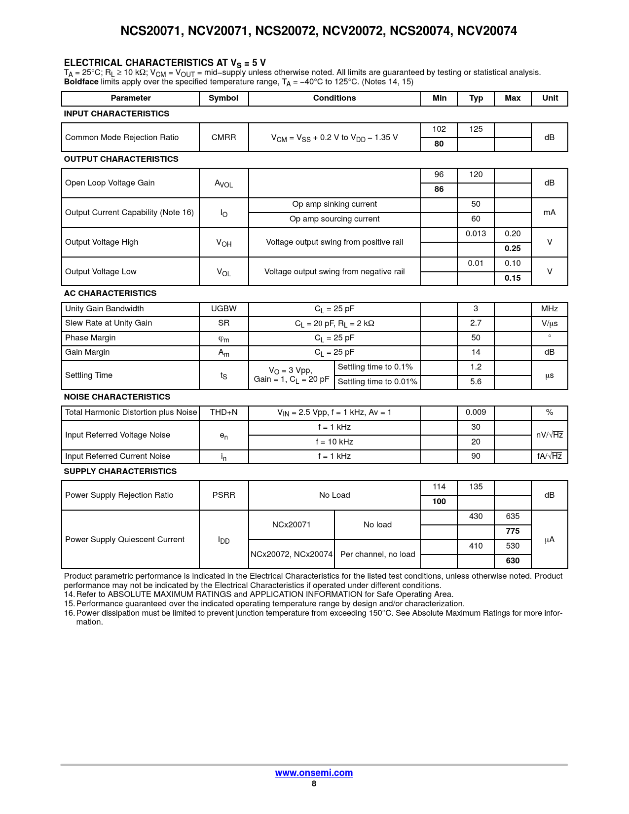 link to page 8 link to page 8 link to page 8 NCS20071, NCV20071, NCS20072, NCV20072, NCS20074, NCV20074ELECTRICAL CHARACTERISTICS AT VS = 5 V TA = 25°C; RL ≥ 10 kW; VCM = VOUT = mid−supply unless otherwise noted. All limits are guaranteed by testing or statistical analysis. Boldface limits apply over the specified temperature range, TA = −40°C to 125°C. (Notes 14, 15) ParameterSymbolConditionsMinTypMaxUnitINPUT CHARACTERISTICS 102 125 Common Mode Rejection Ratio CMRR VCM = VSS + 0.2 V to VDD − 1.35 V dB 80OUTPUT CHARACTERISTICS 96 120 Open Loop Voltage Gain AVOL dB 86 Op amp sinking current 50 Output Current Capability (Note 16) IO mA Op amp sourcing current 60 0.013 0.20 Output Voltage High VOH Voltage output swing from positive rail V 0.25 0.01 0.10 Output Voltage Low VOL Voltage output swing from negative rail V 0.15AC CHARACTERISTICS Unity Gain Bandwidth UGBW CL = 25 pF 3 MHz Slew Rate at Unity Gain SR CL = 20 pF, RL = 2 kW 2.7 V/ms Phase Margin öm CL = 25 pF 50 ° Gain Margin Am CL = 25 pF 14 dB V Settling time to 0.1% 1.2 Settling Time t O = 3 Vpp, S ms Gain = 1, CL = 20 pF Settling time to 0.01% 5.6 NOISE CHARACTERISTICS Total Harmonic Distortion plus Noise THD+N VIN = 2.5 Vpp, f = 1 kHz, Av = 1 0.009 % f = 1 kHz 30 Input Referred Voltage Noise en nV/√Hz f = 10 kHz 20 Input Referred Current Noise in f = 1 kHz 90 fA/√Hz SUPPLY CHARACTERISTICS 114 135 Power Supply Rejection Ratio PSRR No Load dB 100 430 635 NCx20071 No load 775 Power Supply Quiescent Current IDD mA 410 530 NCx20072, NCx20074 Per channel, no load 630 Product parametric performance is indicated in the Electrical Characteristics for the listed test conditions, unless otherwise noted. Product performance may not be indicated by the Electrical Characteristics if operated under different conditions. 14. Refer to ABSOLUTE MAXIMUM RATINGS and APPLICATION INFORMATION for Safe Operating Area. 15. Performance guaranteed over the indicated operating temperature range by design and/or characterization. 16. Power dissipation must be limited to prevent junction temperature from exceeding 150°C. See Absolute Maximum Ratings for more infor- mation. www.onsemi.com8