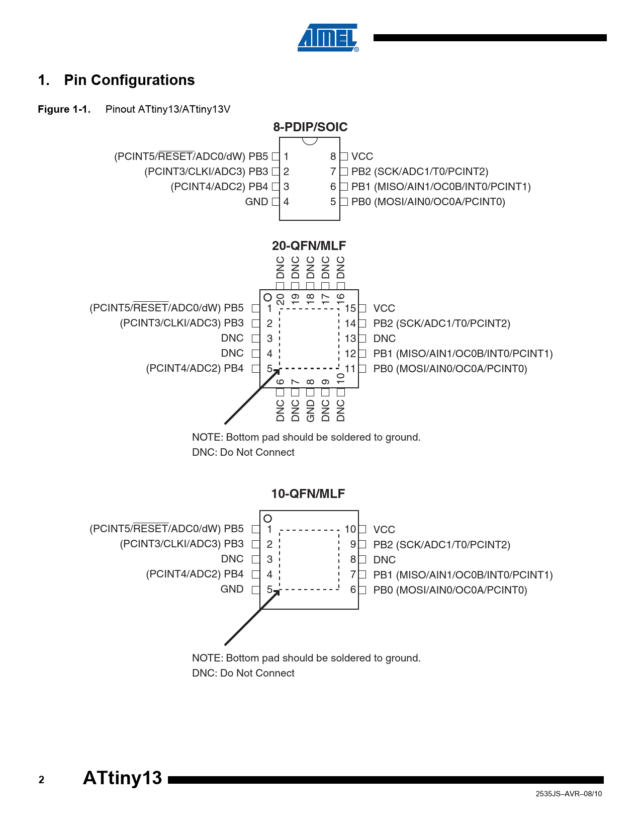 1. Pin Configurations. Figure 1-1. 8-PDIP/SOIC. 20-QFN/MLF. 10-QFN/MLF. ATtiny13