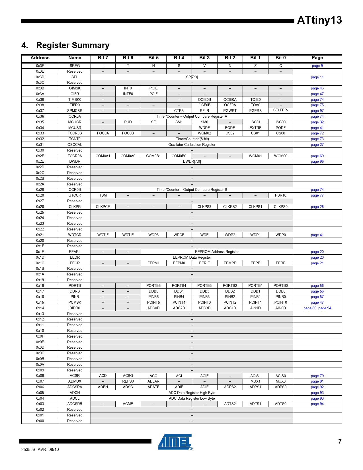 ATtiny13. 4. Register Summary. Address. Name. Bit 7. Bit 6. Bit 5. Bit 4. Bit 3. Bit 2. Bit 1. Bit 0. Page