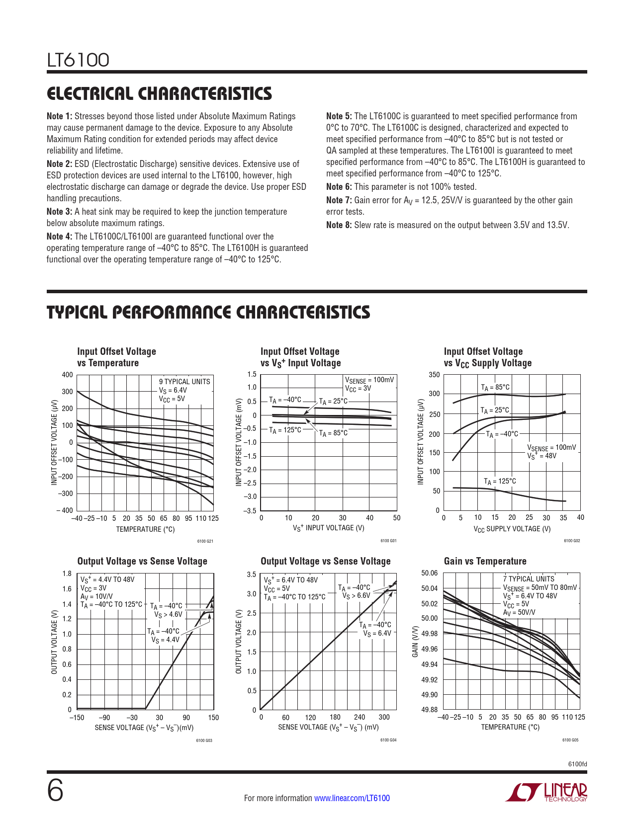 LT6100 ELECTRICAL CHARACTERISTICS Note 1: Stresses beyond those listed under Absolute Maximum Ratings Note 5: The LT6100C is guaranteed to meet specified performance from may cause permanent damage to the device. Exposure to any Absolute 0°C to 70°C. The LT6100C is designed, characterized and expected to Maximum Rating condition for extended periods may affect device meet specified performance from –40°C to 85°C but is not tested or reliability and lifetime. QA sampled at these temperatures. The LT6100I is guaranteed to meet Note 2: ESD (Electrostatic Discharge) sensitive devices. Extensive use of specified performance from –40°C to 85°C. The LT6100H is guaranteed to ESD protection devices are used internal to the LT6100, however, high meet specified performance from –40°C to 125°C. electrostatic discharge can damage or degrade the device. Use proper ESD Note 6: This parameter is not 100% tested. handling precautions. Note 7: Gain error for AV = 12.5, 25V/V is guaranteed by the other gain Note 3: A heat sink may be required to keep the junction temperature error tests. below absolute maximum ratings. Note 8: Slew rate is measured on the output between 3.5V and 13.5V. Note 4: The LT6100C/LT6100I are guaranteed functional over the operating temperature range of –40°C to 85°C. The LT6100H is guaranteed functional over the operating temperature range of –40°C to 125°C. TYPICAL PERFORMANCE CHARACTERISTICSInput Offset VoltageInput Offset VoltageInput Offset Voltagevs Temperaturevs V +S Input Voltagevs VCC Supply Voltage 400 1.5 350 9 TYPICAL UNITS VSENSE = 100mV 300 V 1.0 V T S = 6.4V CC = 3V A = 85°C 300 VCC = 5V 0.5 TA = –40°C TA = 25°C 200 T 0 250 A = 25°C 100 –0.5 TA = 125°C TA = 85°C 200 TA = –40°C 0 –1.0 V 150 SENSE = 100mV + –100 –1.5 VS = 48V –2.0 100 –200 INPUT OFFSET VOLTAGE (µV) INPUT OFFSET VOLTAGE (mV) –2.5 INPUT OFFSET VOLTAGE (µV) TA = 125°C –300 50 –3.0 – 400 –3.5 0 –40 –25 –10 5 20 35 50 65 80 95 110 125 0 10 20 30 40 50 0 5 10 15 20 25 30 35 40 TEMPERATURE (°C) V + S INPUT VOLTAGE (V) VCC SUPPLY VOLTAGE (V) 6100 G21 6100 G01 6100 G02 Output Voltage vs Sense VoltageOutput Voltage vs Sense VoltageGain vs Temperature 1.8 3.5 50.06 V + + S = 4.4V TO 48V VS = 6.4V TO 48V 7 TYPICAL UNITS 1.6 VCC = 3V VCC = 5V TA = –40°C 50.04 VSENSE = 50mV TO 80mV A 3.0 + V = 10V/V TA = –40°C TO 125°C VS > 6.6V VS = 6.4V TO 48V 1.4 TA = –40°C TO 125°C T 50.02 A = –40°C VCC = 5V V 2.5 A 1.2 S > 4.6V 50.00 V = 50V/V TA = –40°C 1.0 TA = –40°C 2.0 V 49.98 V S = 6.4V S = 4.4V 0.8 1.5 49.96 GAIN (V/V) 0.6 49.94 OUTPUT VOLTAGE (V) OUTPUT VOLTAGE (V) 1.0 0.4 49.92 0.2 0.5 49.90 0 0 49.88 –150 –90 –30 30 90 150 0 60 120 180 240 300 –40 –25 –10 5 20 35 50 65 80 95 110 125 SENSE VOLTAGE (V + – + – S – VS )(mV) SENSE VOLTAGE (VS – VS ) (mV) TEMPERATURE (°C) 6100 G03 6100 G04 6100 G05 6100fd 6 For more information www.linear.com/LT6100