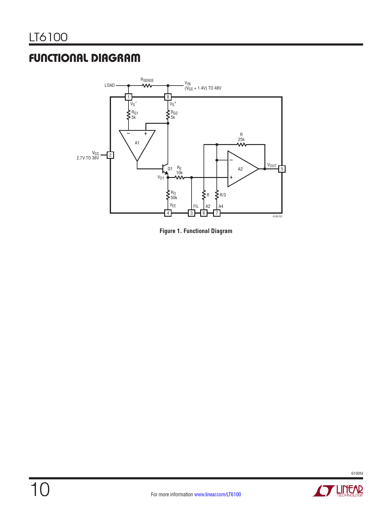 RSENSE LOAD VIN (VCC + 1.4V) TO 48V 1 8 V – + S VS RG1 RG2 5k 5k – + R 25k A1 VCC 2.7V TO 36V 2 – VOUT Q1 RE A2 5 10k + VO1 RO R 50k R/3 VEE FIL A2 A4 4 3 6 7 6100 F01