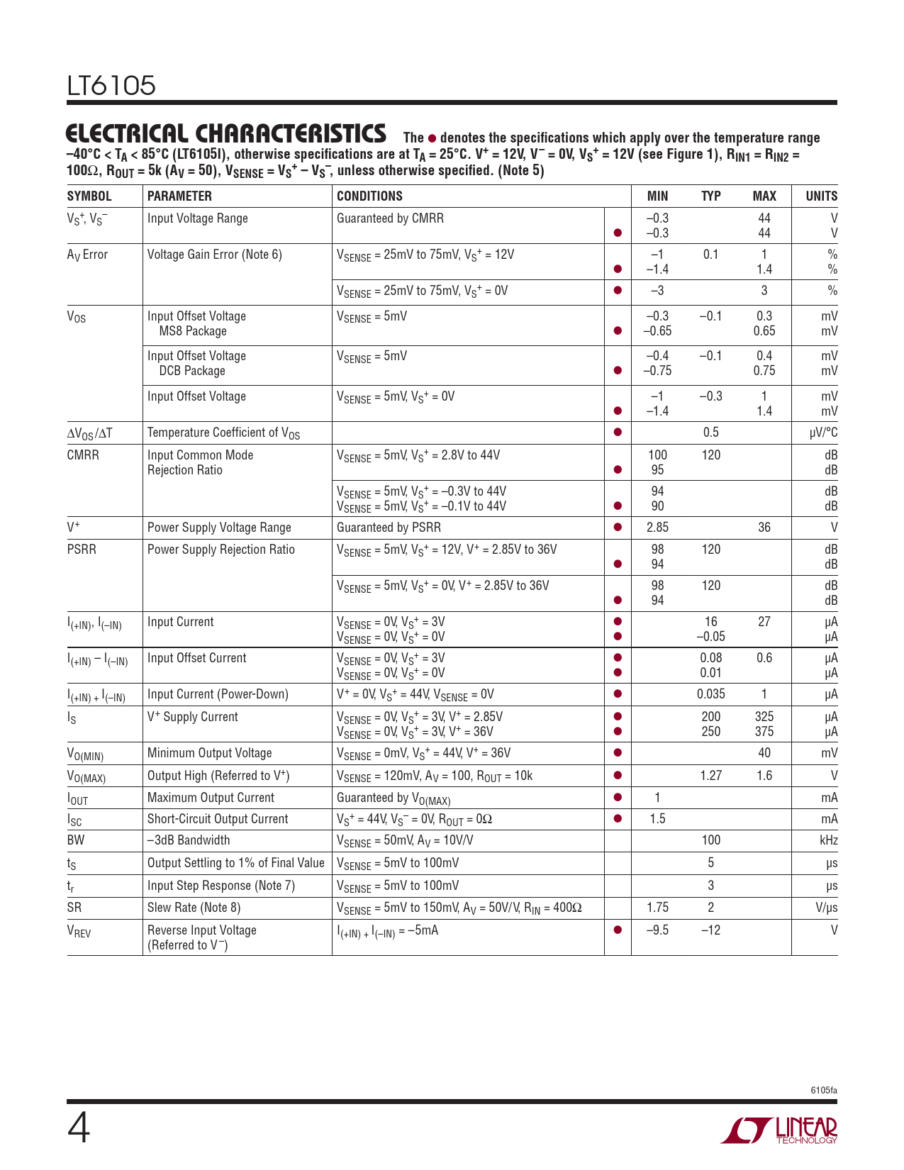 V + – S , VS Input Voltage Range Guaranteed by CMRR –0.3 44 V l –0.3 44 V A + V Error Voltage Gain Error (Note 6) VSENSE = 25mV to 75mV, VS = 12V –1 0.1 1 % l –1.4 1.4 % V + SENSE = 25mV to 75mV, VS = 0V l –3 3 % VOS Input Offset Voltage VSENSE = 5mV –0.3 –0.1 0.3 mV MS8 Package l –0.65 0.65 mV Input Offset Voltage VSENSE = 5mV –0.4 –0.1 0.4 mV DCB Package l –0.75 0.75 mV Input Offset Voltage V + SENSE = 5mV, VS = 0V –1 –0.3 1 mV l –1.4 1.4 mV ΔVOS/ΔT Temperature Coeffi cient of VOS l 0.5 μV/°C CMRR Input Common Mode V + SENSE = 5mV, VS = 2.8V to 44V 100 120 dB Rejection Ratio l 95 dB V + SENSE = 5mV, VS = –0.3V to 44V 94 dB V + SENSE = 5mV, VS = –0.1V to 44V l 90 dB V+ Power Supply Voltage Range Guaranteed by PSRR l 2.85 36 V PSRR Power Supply Rejection Ratio V + SENSE = 5mV, VS = 12V, V+ = 2.85V to 36V 98 120 dB l 94 dB V + SENSE = 5mV, VS = 0V, V+ = 2.85V to 36V 98 120 dB l 94 dB I + (+IN), I(–IN) Input Current VSENSE = 0V, VS = 3V l 16 27 μA V + SENSE = 0V, VS = 0V l –0.05 μA I + (+IN) – I(–IN) Input Offset Current VSENSE = 0V, VS = 3V l 0.08 0.6 μA V + SENSE = 0V, VS = 0V l 0.01 μA I + (+IN) + I(–IN) Input Current (Power-Down) V+ = 0V, VS = 44V, VSENSE = 0V l 0.035 1 μA I + S V+ Supply Current VSENSE = 0V, VS = 3V, V+ = 2.85V l 200 325 μA V + SENSE = 0V, VS = 3V, V+ = 36V l 250 375 μA V + O(MIN) Minimum Output Voltage VSENSE = 0mV, VS = 44V, V+ = 36V l 40 mV VO(MAX) Output High (Referred to V+) VSENSE = 120mV, AV = 100, ROUT = 10k l 1.27 1.6 V IOUT Maximum Output Current Guaranteed by VO(MAX) l 1 mA I + – SC Short-Circuit Output Current VS = 44V, VS = 0V, ROUT = 0Ω l 1.5 mA BW –3dB Bandwidth VSENSE = 50mV, AV = 10V/V 100 kHz tS Output Settling to 1% of Final Value VSENSE = 5mV to 100mV 5 μs tr Input Step Response (Note 7) VSENSE = 5mV to 100mV 3 μs SR Slew Rate (Note 8) VSENSE = 5mV to 150mV, AV = 50V/V, RIN = 400Ω 1.75 2 V/μs VREV Reverse Input Voltage I(+IN) + I(–IN) = –5mA l –9.5 –12 V (Referred to V –) 6105fa 4