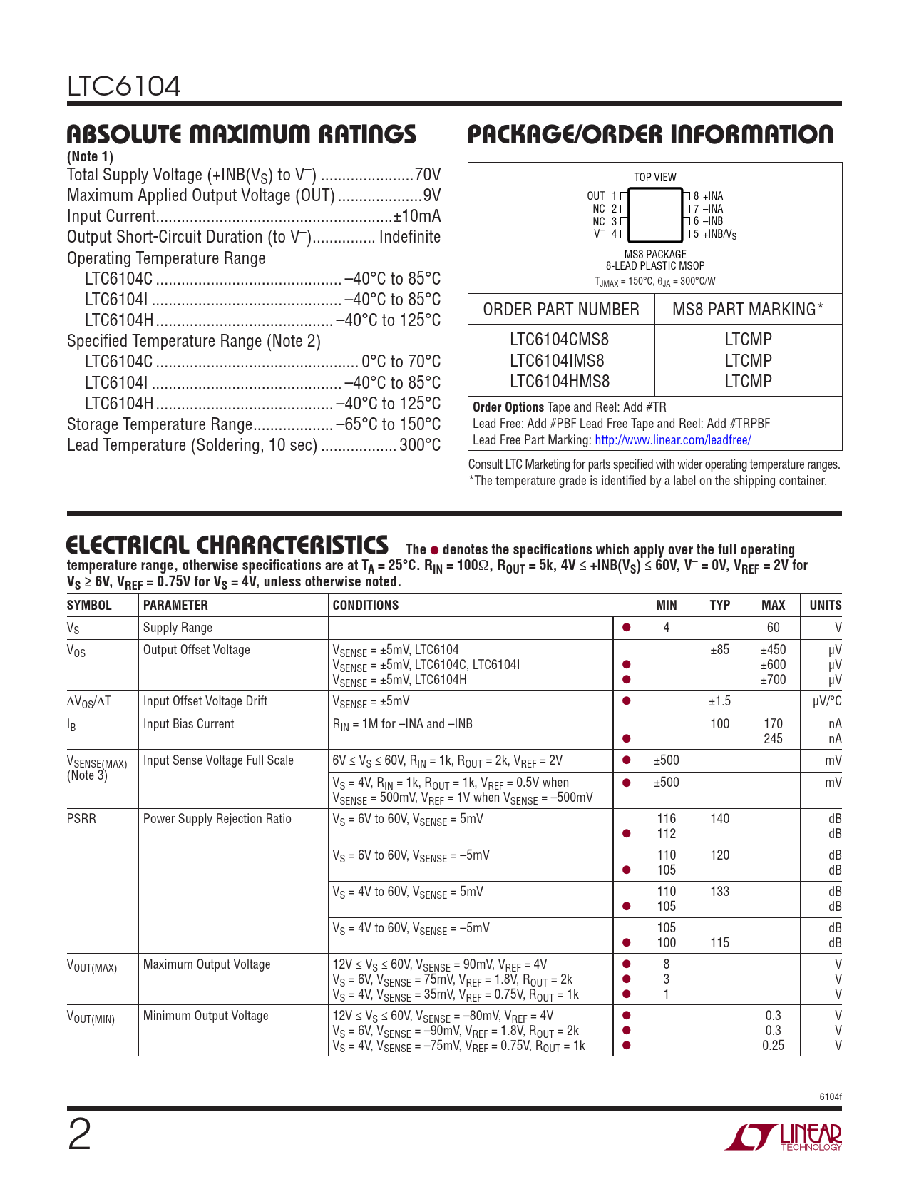 LTC6104 ABSOLUTE MAXIMUM RATINGSPACKAGE/ORDER INFORMATION(Note 1) Total Supply Voltage (+INB(VS) to V–) ..70V TOP VIEW Maximum Applied Output Voltage (OUT) ..9V OUT 1 8 +INA Input Current ..±10mA NC 2 7 –INA NC 3 6 –INB Output Short-Circuit Duration (to V–) ... Indefi nite V– 4 5 +INB/VS Operating Temperature Range MS8 PACKAGE 8-LEAD PLASTIC MSOP LTC6104C .. –40°C to 85°C TJMAX = 150°C, θJA = 300°C/W LTC6104I ... –40°C to 85°C ORDER PART NUMBER MS8 PART MARKING* LTC6104H .. –40°C to 125°C Specifi ed Temperature Range (Note 2) LTC6104CMS8 LTCMP LTC6104C .. 0°C to 70°C LTC6104IMS8 LTCMP LTC6104I ... –40°C to 85°C LTC6104HMS8 LTCMP LTC6104H .. –40°C to 125°C Order Options Tape and Reel: Add #TR Storage Temperature Range ... –65°C to 150°C Lead Free: Add #PBF Lead Free Tape and Reel: Add #TRPBF Lead Temperature (Soldering, 10 sec) .. 300°C Lead Free Part Marking: http://www.linear.com/leadfree/ Consult LTC Marketing for parts specifi ed with wider operating temperature ranges. *The temperature grade is identifi ed by a label on the shipping container. ELECTRICAL CHARACTERISTICSThe ● denotes the specifi cations which apply over the full operatingtemperature range, otherwise specifi cations are at TA = 25°C. RIN = 100 Ω , ROUT = 5k, 4V ≤ +INB(VS) ≤ 60V, V– = 0V, VREF = 2V for VS ≥ 6V, VREF = 0.75V for VS = 4V, unless otherwise noted. SYMBOLPARAMETERCONDITIONSMINTYPMAXUNITS VS Supply Range ● 4 60 V VOS Output Offset Voltage VSENSE = ±5mV, LTC6104 ±85 ±450 µV VSENSE = ±5mV, LTC6104C, LTC6104I ● ±600 µV VSENSE = ±5mV, LTC6104H ● ±700 µV ΔVOS/ΔT Input Offset Voltage Drift VSENSE = ±5mV ● ±1.5 µV/°C IB Input Bias Current RIN = 1M for –INA and –INB 100 170 nA ● 245 nA VSENSE(MAX) Input Sense Voltage Full Scale 6V ≤ VS ≤ 60V, RIN = 1k, ROUT = 2k, VREF = 2V ● ±500 mV (Note 3) VS = 4V, RIN = 1k, ROUT = 1k, VREF = 0.5V when ● ±500 mV VSENSE = 500mV, VREF = 1V when VSENSE = –500mV PSRR Power Supply Rejection Ratio VS = 6V to 60V, VSENSE = 5mV 116 140 dB ● 112 dB VS = 6V to 60V, VSENSE = –5mV 110 120 dB ● 105 dB VS = 4V to 60V, VSENSE = 5mV 110 133 dB ● 105 dB VS = 4V to 60V, VSENSE = –5mV 105 dB ● 100 115 dB VOUT(MAX) Maximum Output Voltage 12V ≤ VS ≤ 60V, VSENSE = 90mV, VREF = 4V ● 8 V VS = 6V, VSENSE = 75mV, VREF = 1.8V, ROUT = 2k ● 3 V VS = 4V, VSENSE = 35mV, VREF = 0.75V, ROUT = 1k ● 1 V VOUT(MIN) Minimum Output Voltage 12V ≤ VS ≤ 60V, VSENSE = –80mV, VREF = 4V ● 0.3 V VS = 6V, VSENSE = –90mV, VREF = 1.8V, ROUT = 2k ● 0.3 V VS = 4V, VSENSE = –75mV, VREF = 0.75V, ROUT = 1k ● 0.25 V 6104f 2