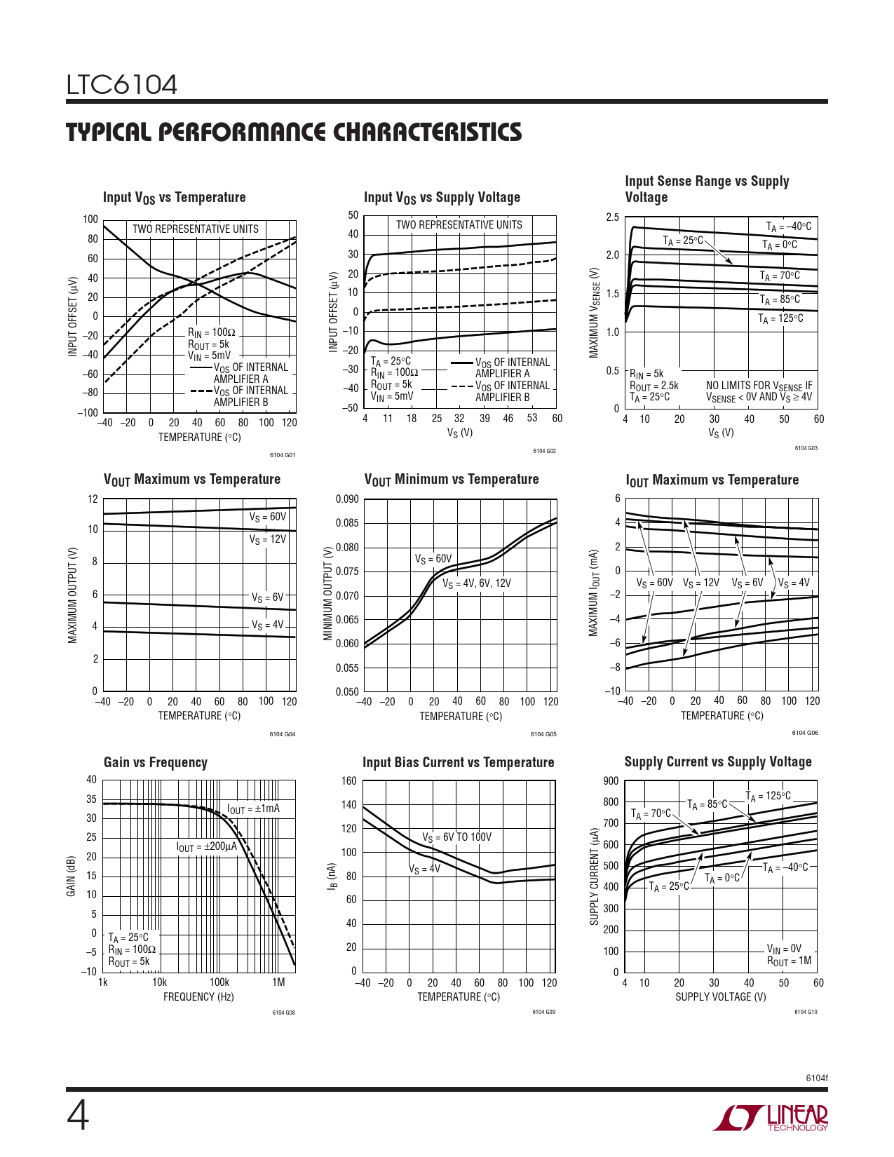 LTC6104 TYPICAL PERFORMANCE CHARACTERISTICSInput Sense Range vs SupplyInput VOS vs TemperatureInput VOS vs Supply VoltageVoltage 100 50 2.5 TWO REPRESENTATIVE UNITS TWO REPRESENTATIVE UNITS TA = –40°C 80 40 TA = 25°C TA = 0°C 60 30 2.0 40 20 (V) TA = 70°C µV) µV) 20 10 1.5 SENSE TA = 85°C 0 0 TA = 125°C –20 RIN = 100Ω –10 1.0 ROUT = 5k INPUT OFFSET ( INPUT OFFSET ( –40 –20 VIN = 5mV MAXIMUM V T V V A = 25°C OS OF INTERNAL –60 OS OF INTERNAL –30 R AMPLIFIER A 0.5 R AMPLIFIER A IN = 100Ω IN = 5k ROUT = 5k V ROUT = 2.5k NO LIMITS FOR VSENSE IF –80 V –40 OS OF INTERNAL OS OF INTERNAL V AMPLIFIER B T V AMPLIFIER B IN = 5mV A = 25°C SENSE < 0V AND VS ≥ 4V –100 –50 0 –40 –20 0 20 40 60 80 100 120 4 11 18 25 32 39 46 53 60 4 10 20 30 40 50 60 TEMPERATURE (°C) VS (V) VS (V) 6104 G02 6104 G03 6104 G01 VOUT Maximum vs TemperatureVOUT Minimum vs TemperatureIOUT Maximum vs Temperature 12 0.090 6 VS = 60V 0.085 4 10 VS = 12V 0.080 2 8 VS = 60V 0.075 (mA) 0 VS = 4V, 6V, 12V OUT V V V S = 60V S = 12V S = 6V VS = 4V 6 V 0.070 –2 S = 6V 0.065 –4 4 VS = 4V MAXIMUM I MAXIMUM OUTPUT (V) MINIMUM OUTPUT (V) 0.060 –6 2 0.055 –8 0 0.050 –10 –40 –20 0 20 40 60 80 100 120 –40 –20 0 20 40 60 80 100 120 –40 –20 0 20 40 60 80 100 120 TEMPERATURE (°C) TEMPERATURE (°C) TEMPERATURE (°C) 6104 G04 6104 G05 6104 G06 Gain vs FrequencyInput Bias Current vs TemperatureSupply Current vs Supply Voltage 40 160 900 35 T 800 A = 125°C I 140 TA = 85°C OUT = ±1mA 30 TA = 70°C 700 120 25 VS = 6V TO 100V µA) I 600 OUT = ±200µA 20 100 V 500 TA = –40°C 15 80 S = 4V (nA) TA = 0°C I B 400 T GAIN (dB) A = 25°C 10 60 300 5 40 SUPPLY CURRENT ( 0 200 TA = 25°C 20 –5 RIN = 100Ω 100 VIN = 0V ROUT = 5k ROUT = 1M –10 0 0 1k 10k 100k 1M –40 –20 0 20 40 60 80 100 120 4 10 20 30 40 50 60 FREQUENCY (Hz) TEMPERATURE (°C) SUPPLY VOLTAGE (V) 6104 G08 6104 G09 6104 G10 6104f 4