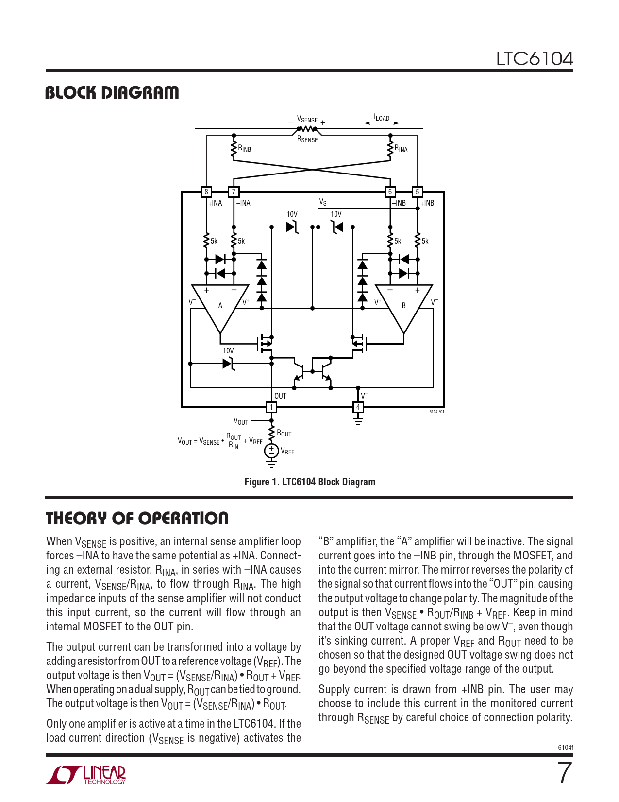 LTC6104 BLOCK DIAGRAM I V LOAD SENSE – + RSENSE RINB RINA 8 7 6 5 +INA –INA VS –INB +INB 10V 10V 5k 5k 5k 5k + – – + V– A V+ B V– V+ 10V OUT V– 1 4 6104 F01 VOUT ROUT R V OUT + V OUT = VSENSE • REF RIN + VREF – Figure 1. LTC6104 Block DiagramTHEORY OF OPERATION When VSENSE is positive, an internal sense amplifi er loop “B” amplifi er, the “A” amplifi er will be inactive. The signal forces –INA to have the same potential as +INA. Connect- current goes into the –INB pin, through the MOSFET, and ing an external resistor, RINA, in series with –INA causes into the current mirror. The mirror reverses the polarity of a current, VSENSE/RINA, to fl ow through RINA. The high the signal so that current fl ows into the “OUT” pin, causing impedance inputs of the sense amplifi er will not conduct the output voltage to change polarity. The magnitude of the this input current, so the current will fl ow through an output is then VSENSE • ROUT/RINB + VREF . Keep in mind internal MOSFET to the OUT pin. that the OUT voltage cannot swing below V–, even though it’s sinking current. A proper V The output current can be transformed into a voltage by REF and ROUT need to be chosen so that the designed OUT voltage swing does not adding a resistor from OUT to a reference voltage (VREF). The go beyond the specifi ed voltage range of the output. output voltage is then VOUT = (VSENSE/RINA) • ROUT + VREF. When operating on a dual supply, ROUT can be tied to ground. Supply current is drawn from +INB pin. The user may The output voltage is then VOUT = (VSENSE/RINA) • ROUT. choose to include this current in the monitored current through R Only one amplifi er is active at a time in the LTC6104. If the SENSE by careful choice of connection polarity. load current direction (VSENSE is negative) activates the 6104f 7