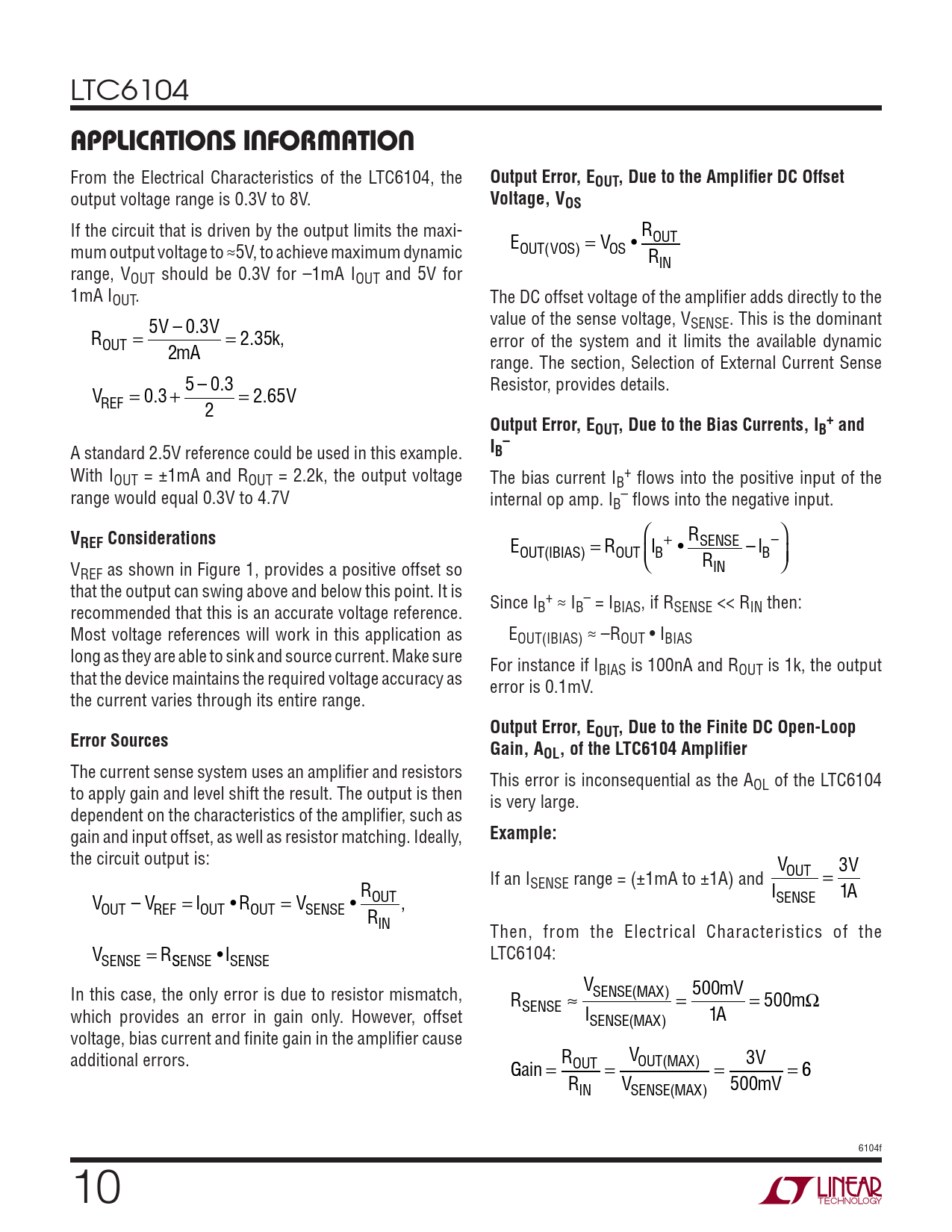 the circuit output is: V V If an I OUT = 3 R SENSE range = (±1mA to ±1A) and I A 1 V – V = I • R = V OUT SENSE OUT REF OUT OUT SENSE • , RIN Then, from the Electrical Characteristics of the V = R • I LTC6104: SENSE S SENSE SENSE V In this case, the only error is due to resistor mismatch, SENSE M ( AX) mV 500 R ≈ = = m SENSE 500 Ω which provides an error in gain only. However, offset I A SENSE M ( AX) 1 voltage, bias current and fi nite gain in the amplifi er cause additional errors. R VOUT MA ( X) 3V G Gain OUT = = = = 6 R V mV 500 IN SENSE M ( AX) 6104f 10