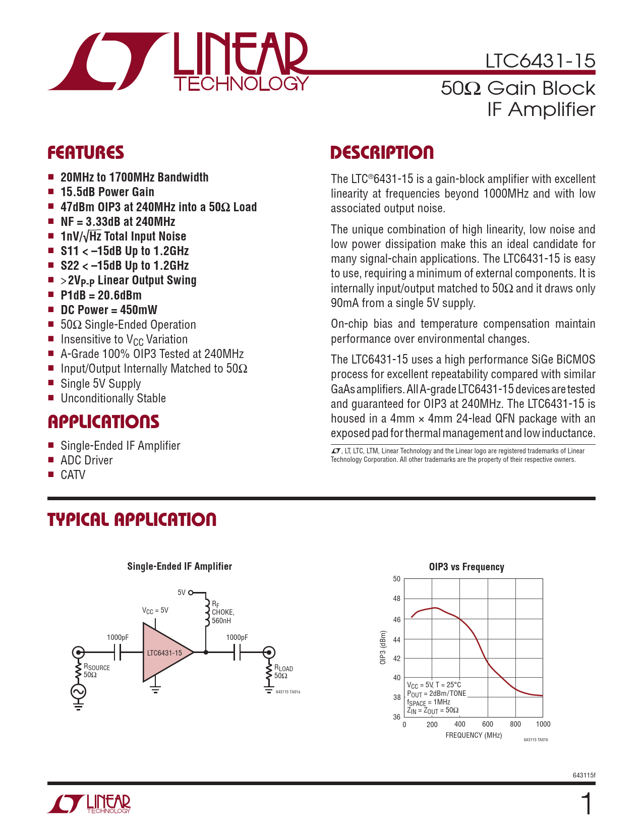 LTC6431-15 50Ω Gain Block IF Amplifier FeaTuresDescripTion n 20MHz to 1700MHz Bandwidth The LTC®6431-15 is a gain-block amplifier with excellent n 15.5dB Power Gain linearity at frequencies beyond 1000MHz and with low n 47dBm OIP3 at 240MHz into a 50Ω Load associated output noise. n NF = 3.33dB at 240MHz The unique combination of high linearity, low noise and n 1nV/√Hz Total Input Noise low power dissipation make this an ideal candidate for n S11 < –15dB Up to 1.2GHz many signal-chain applications. The LTC6431-15 is easy n S22 < –15dB Up to 1.2GHz to use, requiring a minimum of external components. It is n > 2VP-P Linear Output Swing internally input/output matched to 50Ω and it draws only n P1dB = 20.6dBm 90mA from a single 5V supply. n DC Power = 450mW n 50Ω Single-Ended Operation On-chip bias and temperature compensation maintain n Insensitive to V performance over environmental changes. CC Variation n A-Grade 100% OIP3 Tested at 240MHz The LTC6431-15 uses a high performance SiGe BiCMOS n Input/Output Internally Matched to 50Ω process for excellent repeatability compared with similar n Single 5V Supply GaAs amplifiers. All A-grade LTC6431-15 devices are tested n Unconditionally Stable and guaranteed for OIP3 at 240MHz. The LTC6431-15 is housed in a 4mm × 4mm 24-lead QFN package with an applicaTions exposed pad for thermal management and low inductance. n Single-Ended IF Amplifier L, LT, LTC, LTM, Linear Technology and the Linear logo are registered trademarks of Linear n ADC Driver Technology Corporation. All other trademarks are the property of their respective owners. n CATV Typical applicaTionSingle-Ended IF AmplifierOIP3 vs Frequency 50 5V 48 R V F CC = 5V CHOKE, 560nH 46 1000pF 1000pF 44 LTC6431-15 42 R OIP3 (dBm) SOURCE RLOAD 50Ω 50Ω 40 VCC = 5V, T = 25°C 643115 TA01a 38 POUT = 2dBm/TONE fSPACE = 1MHz ZIN = ZOUT = 50Ω 36 0 200 400 600 800 1000 FREQUENCY (MHz) 643115 TA01b 643115f 1 Document Outline Features Applications Description Typical Application Absolute Maximum Ratings Pin Configuration Order Information DC Electrical Characteristics AC Electrical Characteristics Typical Performance Characteristics Pin Functions Block Diagram Test Circuit A Operation Applications Information S Parameters Package Description Related Parts