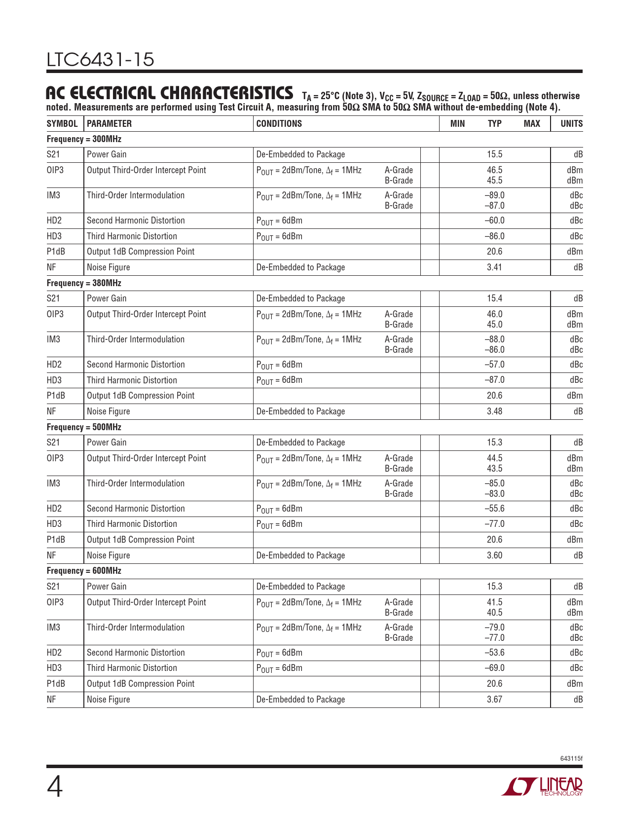 LTC6431-15 ac elecTrical characTerisTicsTA = 25°C (Note 3), VCC = 5V, ZSOURCE = ZLOAD = 50Ω, unless otherwisenoted. Measurements are performed using Test Circuit A, measuring from 50Ω SMA to 50Ω SMA without de-embedding (Note 4).SYMBOL PARAMETERCONDITIONSMINTYPMAXUNITSFrequency = 300MHz S21 Power Gain De-Embedded to Package 15.5 dB OIP3 Output Third-Order Intercept Point POUT = 2dBm/Tone, Δf = 1MHz A-Grade 46.5 dBm B-Grade 45.5 dBm IM3 Third-Order Intermodulation POUT = 2dBm/Tone, Δf = 1MHz A-Grade –89.0 dBc B-Grade –87.0 dBc HD2 Second Harmonic Distortion POUT = 6dBm –60.0 dBc HD3 Third Harmonic Distortion POUT = 6dBm –86.0 dBc P1dB Output 1dB Compression Point 20.6 dBm NF Noise Figure De-Embedded to Package 3.41 dB Frequency = 380MHz S21 Power Gain De-Embedded to Package 15.4 dB OIP3 Output Third-Order Intercept Point POUT = 2dBm/Tone, Δf = 1MHz A-Grade 46.0 dBm B-Grade 45.0 dBm IM3 Third-Order Intermodulation POUT = 2dBm/Tone, Δf = 1MHz A-Grade –88.0 dBc B-Grade –86.0 dBc HD2 Second Harmonic Distortion POUT = 6dBm –57.0 dBc HD3 Third Harmonic Distortion POUT = 6dBm –87.0 dBc P1dB Output 1dB Compression Point 20.6 dBm NF Noise Figure De-Embedded to Package 3.48 dB Frequency = 500MHz S21 Power Gain De-Embedded to Package 15.3 dB OIP3 Output Third-Order Intercept Point POUT = 2dBm/Tone, Δf = 1MHz A-Grade 44.5 dBm B-Grade 43.5 dBm IM3 Third-Order Intermodulation POUT = 2dBm/Tone, Δf = 1MHz A-Grade –85.0 dBc B-Grade –83.0 dBc HD2 Second Harmonic Distortion POUT = 6dBm –55.6 dBc HD3 Third Harmonic Distortion POUT = 6dBm –77.0 dBc P1dB Output 1dB Compression Point 20.6 dBm NF Noise Figure De-Embedded to Package 3.60 dB Frequency = 600MHz S21 Power Gain De-Embedded to Package 15.3 dB OIP3 Output Third-Order Intercept Point POUT = 2dBm/Tone, Δf = 1MHz A-Grade 41.5 dBm B-Grade 40.5 dBm IM3 Third-Order Intermodulation POUT = 2dBm/Tone, Δf = 1MHz A-Grade –79.0 dBc B-Grade –77.0 dBc HD2 Second Harmonic Distortion POUT = 6dBm –53.6 dBc HD3 Third Harmonic Distortion POUT = 6dBm –69.0 dBc P1dB Output 1dB Compression Point 20.6 dBm NF Noise Figure De-Embedded to Package 3.67 dB 643115f 4 Document Outline Features Applications Description Typical Application Absolute Maximum Ratings Pin Configuration Order Information DC Electrical Characteristics AC Electrical Characteristics Typical Performance Characteristics Pin Functions Block Diagram Test Circuit A Operation Applications Information S Parameters Package Description Related Parts