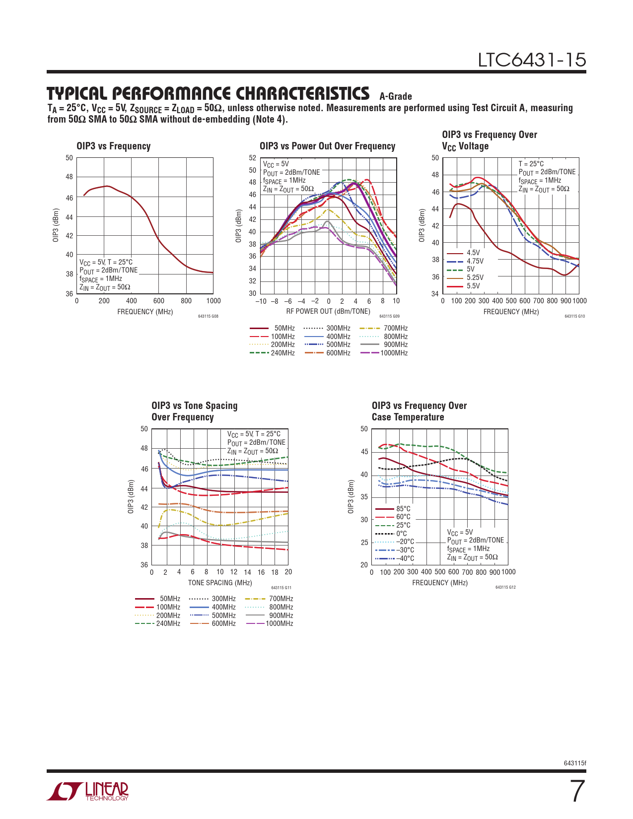 Typical perForMance characTerisTics A-Grade TA = 25°C, VCC = 5V, ZSOURCE = ZLOAD = 50Ω, unless otherwise noted. Measurements are performed using Test Circuit A, measuring from 50Ω SMA to 50Ω SMA without de-embedding (Note 4). OIP3 vs Frequency Over OIP3 vs Frequency OIP3 vs Power Out Over Frequency VCC Voltage