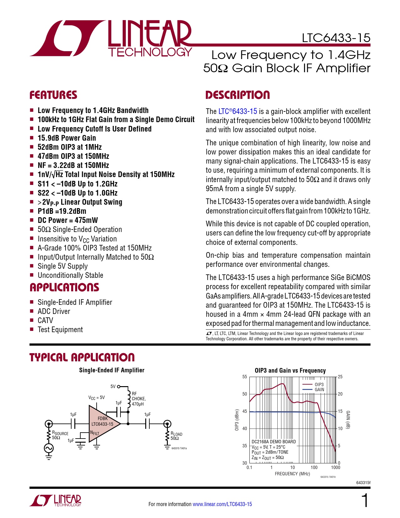 LTC6433-15 Low Frequency to 1.4GHz 50Ω Gain Block IF Amplifier FeaTuresDescripTion n Low Frequency to 1.4GHz Bandwidth The LTC®6433-15 is a gain-block amplifier with excellent n 100kHz to 1GHz Flat Gain from a Single Demo Circuit linearity at frequencies below 100kHz to beyond 1000MHz n Low Frequency Cutoff Is User Defined and with low associated output noise. n 15.9dB Power Gain The unique combination of high linearity, low noise and n 52dBm OIP3 at 1MHz low power dissipation makes this an ideal candidate for n 47dBm OIP3 at 150MHz many signal-chain applications. The LTC6433-15 is easy n NF = 3.22dB at 150MHz to use, requiring a minimum of external components. It is n 1nV/√Hz Total Input Noise Density at 150MHz internally input/output matched to 50Ω and it draws only n S11 < –10dB Up to 1.2GHz 95mA from a single 5V supply. n S22 < –10dB Up to 1.0GHz n > 2V The LTC6433-15 operates over a wide bandwidth. A single P-P Linear Output Swing n P1dB =19.2dBm demonstration circuit offers flat gain from 100kHz to 1GHz. n DC Power = 475mW While this device is not capable of DC coupled operation, n 50Ω Single-Ended Operation users can define the low frequency cut-off by appropriate n Insensitive to VCC Variation choice of external components. n A-Grade 100% OIP3 Tested at 150MHz n Input/Output Internally Matched to 50Ω On-chip bias and temperature compensation maintain n Single 5V Supply performance over environmental changes. n Unconditionally Stable The LTC6433-15 uses a high performance SiGe BiCMOS process for excellent repeatability compared with similar applicaTions GaAs amplifiers. All A-grade LTC6433-15 devices are tested n Single-Ended IF Amplifier and guaranteed for OIP3 at 150MHz. The LTC6433-15 is n ADC Driver housed in a 4mm × 4mm 24-lead QFN package with an n CATV exposed pad for thermal management and low inductance. n Test Equipment L, LT, LTC, LTM, Linear Technology and the Linear logo are registered trademarks of Linear Technology Corporation. All other trademarks are the property of their respective owners. Typical applicaTionSingle-Ended IF AmplifierOIP3 and Gain vs Frequency 55 25 5V OIP3 GAIN RF 50 20 VCC = 5V CHOKE, 1µF 470µH 45 15 GAIN (dB) 1µF 1µF FDBK LTC6433-15 OIP3 (dBm) 40 10 RSOURCE NFILT RLOAD 50Ω 1µF 50Ω DC2168A DEMO BOARD 35 V 5 643315 TA01a CC = 5V, T = 25°C POUT = 2dBm/TONE ZIN = ZOUT = 50Ω 30 0 0.1 1 10 100 1000 FREQUENCY (MHz) 643315 TA01b 643315f For more information www.linear.com/LTC6433-15 1 Document Outline Features Applications Description Typical Application Absolute Maximum Ratings Pin Configuration Order Information DC Electrical Characteristics AC Electrical Characteristics Typical Performance Characteristics Pin Functions Block Diagram Test Circuit A Operation Applications Information S Parameters Package Description Related Parts Features Applications Typical Application Description Absolute Maximum Ratings Order Information DC Electrical Characteristics Pin Configuration AC Electrical Characteristics Typical Performance Characteristics Pin Functions Block Diagram Test Circuit A Operation S Parameters Package Description Typical Application Related Parts