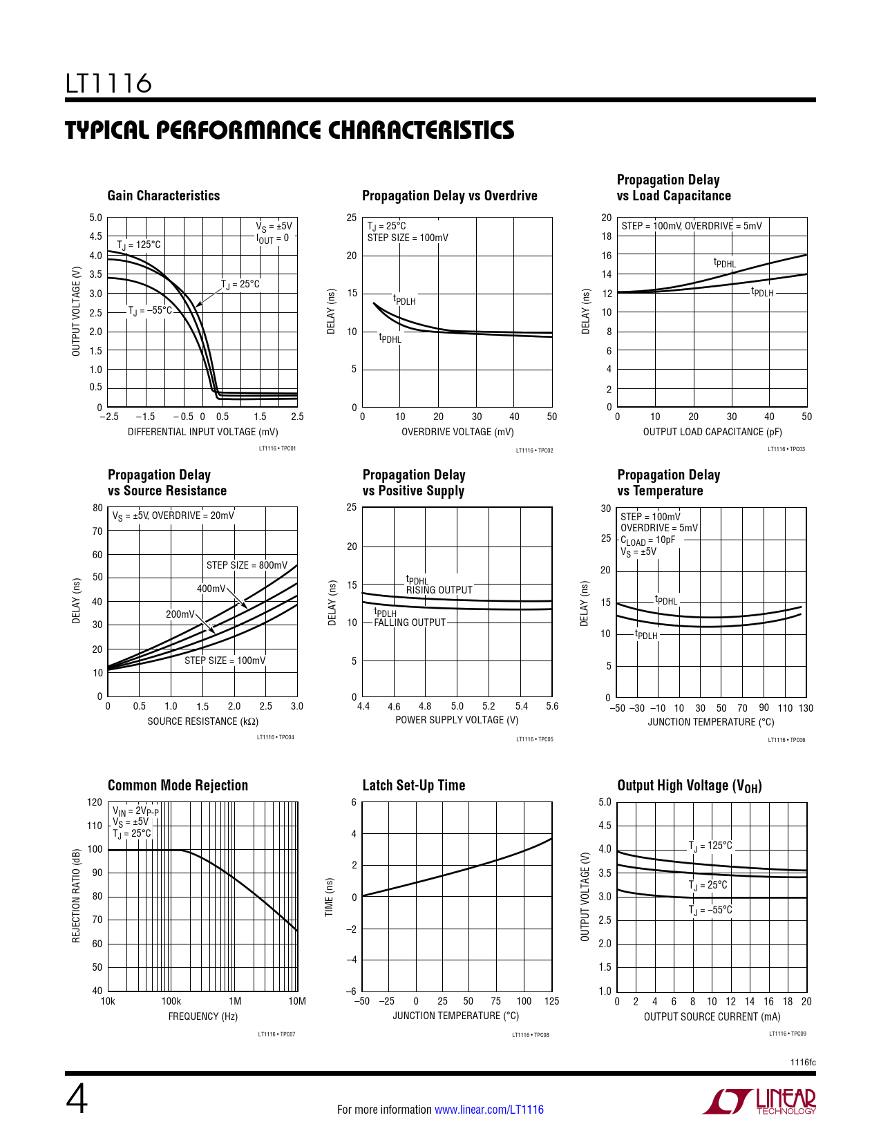 120 6 5.0 VIN = 2VP-P 110 VS = ±5V 4.5 TJ = 25°C 4 100 4.0 TJ = 125°C 2 90 3.5 TJ = 25°C 80 0 3.0 TIME (ns) TJ = –55°C 70 2.5 –2 REJECTION RATIO (dB) 60 OUTPUT VOLTAGE (V) 2.0 –4 50 1.5 40 –6 1.0 10k 100k 1M 10M –50 –25 0 25 50 75 100 125 0 2 4 6 8 10 12 14 16 18 20 FREQUENCY (Hz) JUNCTION TEMPERATURE (°C) OUTPUT SOURCE CURRENT (mA) LT1116 • TPC07 LT1116 • TPC08 LT1116 • TPC09 1116fc 4 For more information www.linear.com/LT1116