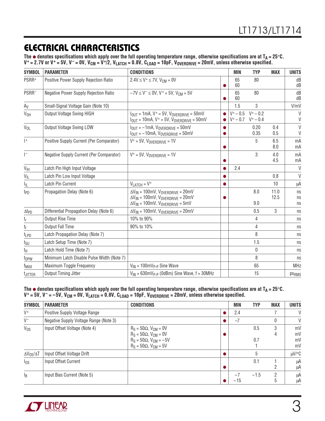 PSRR+ Positive Power Supply Rejection Ratio 2.4V ≤ V+ ≤ 7V, VCM = 0V 65 80 dB ● 60 dB PSRR– Negative Power Supply Rejection Ratio – 7V ≤ V– ≤ 0V, V + = 5V, VCM = 5V 65 80 dB ● 60 dB AV Small-Signal Voltage Gain (Note 10) 1.5 3 V/mV VOH Output Voltage Swing HIGH IOUT = 1mA, V+ = 5V, VOVERDRIVE = 50mV ● V+ – 0.5 V+ – 0.2 V IOUT = 10mA, V+ = 5V, VOVERDRIVE = 50mV ● V+ – 0.7 V+ – 0.4 V VOL Output Voltage Swing LOW IOUT = – 1mA, VOVERDRIVE = 50mV ● 0.20 0.4 V IOUT = – 10mA, VOVERDRIVE = 50mV ● 0.35 0.5 V I+ Positive Supply Current (Per Comparator) V+ = 5V, VOVERDRIVE = 1V 5 6.5 mA ● 8.0 mA I– Negative Supply Current (Per Comparator) V+ = 5V, VOVERDRIVE = 1V 3 4.0 mA ● 4.5 mA VIH Latch Pin High Input Voltage ● 2.4 V VIL Latch Pin Low Input Voltage ● 0.8 V IIL Latch Pin Current VLATCH = V+ ● 10 µA tPD Propagation Delay (Note 6) ∆VIN = 100mV, VOVERDRIVE = 20mV 8.0 11.0 ns ∆VIN = 100mV, VOVERDRIVE = 20mV ● 12.5 ns ∆VIN = 100mV, VOVERDRIVE = 5mV 9.0 ns ∆tPD Differential Propagation Delay (Note 6) ∆VIN = 100mV, VOVERDRIVE = 20mV 0.5 3 ns tr Output Rise Time 10% to 90% 4 ns tf Output Fall Time 90% to 10% 4 ns tLPD Latch Propagation Delay (Note 7) 8 ns tSU Latch Setup Time (Note 7) 1.5 ns tH Latch Hold Time (Note 7) 0 ns tDPW Minimum Latch Disable Pulse Width (Note 7) 8 ns fMAX Maximum Toggle Frequency VIN = 100mVP-P Sine Wave 65 MHz tJITTER Output Timing Jitter VIN = 630mVP-P (0dBm) Sine Wave, f = 30MHz 15 psRMS