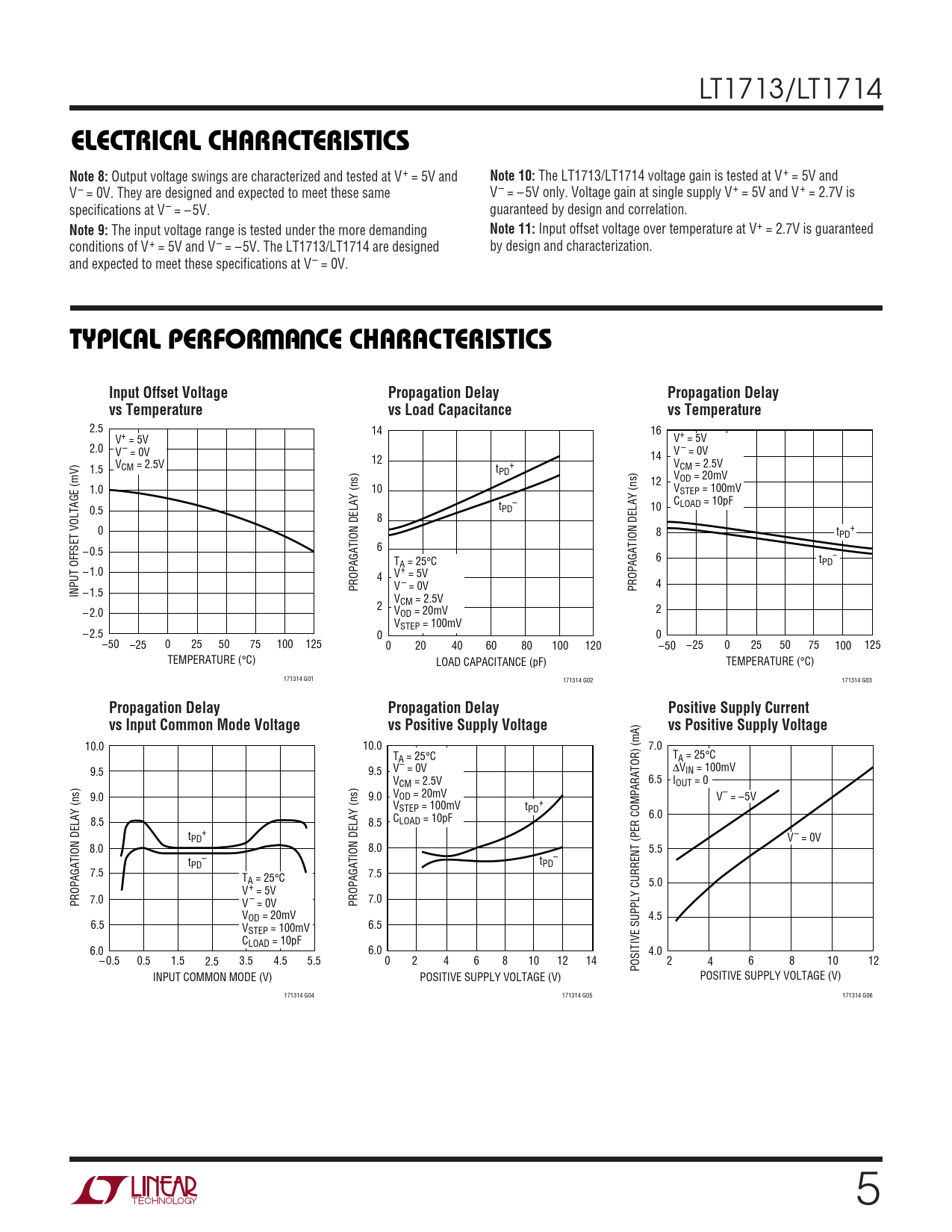LT1713/LT1714 ELECTRICAL CHARACTERISTICSNote 8: Output voltage swings are characterized and tested at V+ = 5V and Note 10: The LT1713/LT1714 voltage gain is tested at V+ = 5V and V– = 0V. They are designed and expected to meet these same V– = – 5V only. Voltage gain at single supply V+ = 5V and V+ = 2.7V is specifications at V– = – 5V. guaranteed by design and correlation. Note 9: The input voltage range is tested under the more demanding Note 11: Input offset voltage over temperature at V+ = 2.7V is guaranteed conditions of V+ = 5V and V– = –5V. The LT1713/LT1714 are designed by design and characterization. and expected to meet these specifications at V– = 0V. WUTYPICAL PERFOR A CE CHARACTERISTICSInput Offset VoltagePropagation DelayPropagation Delayvs Temperaturevs Load Capacitancevs Temperature 2.5 14 16 V+ = 5V V+ = 5V 2.0 V – = 0V V – = 0V 12 14 V 1.5 VCM = 2.5V t + CM = 2.5V PD V 12 OD = 20mV 1.0 10 VSTEP = 100mV – CLOAD = 10pF 0.5 tPD 10 8 0 8 t + PD – 0.5 6 – T 6 t A = 25°C PD – 1.0 4 V+ = 5V PROPAGATION DELAY (ns) V – = 0V PROPAGATION DELAY (ns) 4 INPUT OFFSET VOLTAGE (mV) – 1.5 V 2 CM = 2.5V – 2.0 V 2 OD = 20mV VSTEP = 100mV – 2.5 0 0 –50 –25 0 25 50 75 100 125 0 20 40 60 80 100 120 –50 –25 0 25 50 75 100 125 TEMPERATURE (°C) LOAD CAPACITANCE (pF) TEMPERATURE (°C) 171314 G01 171314 G02 171314 G03 Propagation DelayPropagation DelayPositive Supply Currentvs Input Common Mode Voltagevs Positive Supply Voltagevs Positive Supply Voltage 10.0 10.0 7.0 TA = 25°C TA = 25°C ∆ 9.5 9.5 V– = 0V VIN = 100mV V 6.5 CM = 2.5V IOUT = 0 9.0 9.0 VOD = 20mV V– = –5V V + STEP = 100mV tPD 6.0 8.5 8.5 CLOAD = 10pF t + PD V– = 0V 8.0 8.0 5.5 – t – PD tPD 7.5 T 7.5 A = 25°C 5.0 V+ = 5V PROPAGATION DELAY (ns) 7.0 V – = 0V PROPAGATION DELAY (ns) 7.0 VOD = 20mV 4.5 6.5 V 6.5 STEP = 100mV CLOAD = 10pF 6.0 6.0 4.0 – 0.5 0.5 1.5 2.5 3.5 4.5 5.5 0 2 4 6 8 10 12 14 2 4 6 8 10 12 POSITIVE SUPPLY CURRENT (PER COMPARATOR) (mA) INPUT COMMON MODE (V) POSITIVE SUPPLY VOLTAGE (V) POSITIVE SUPPLY VOLTAGE (V) 171314 G04 171314 G05 171314 G06 5