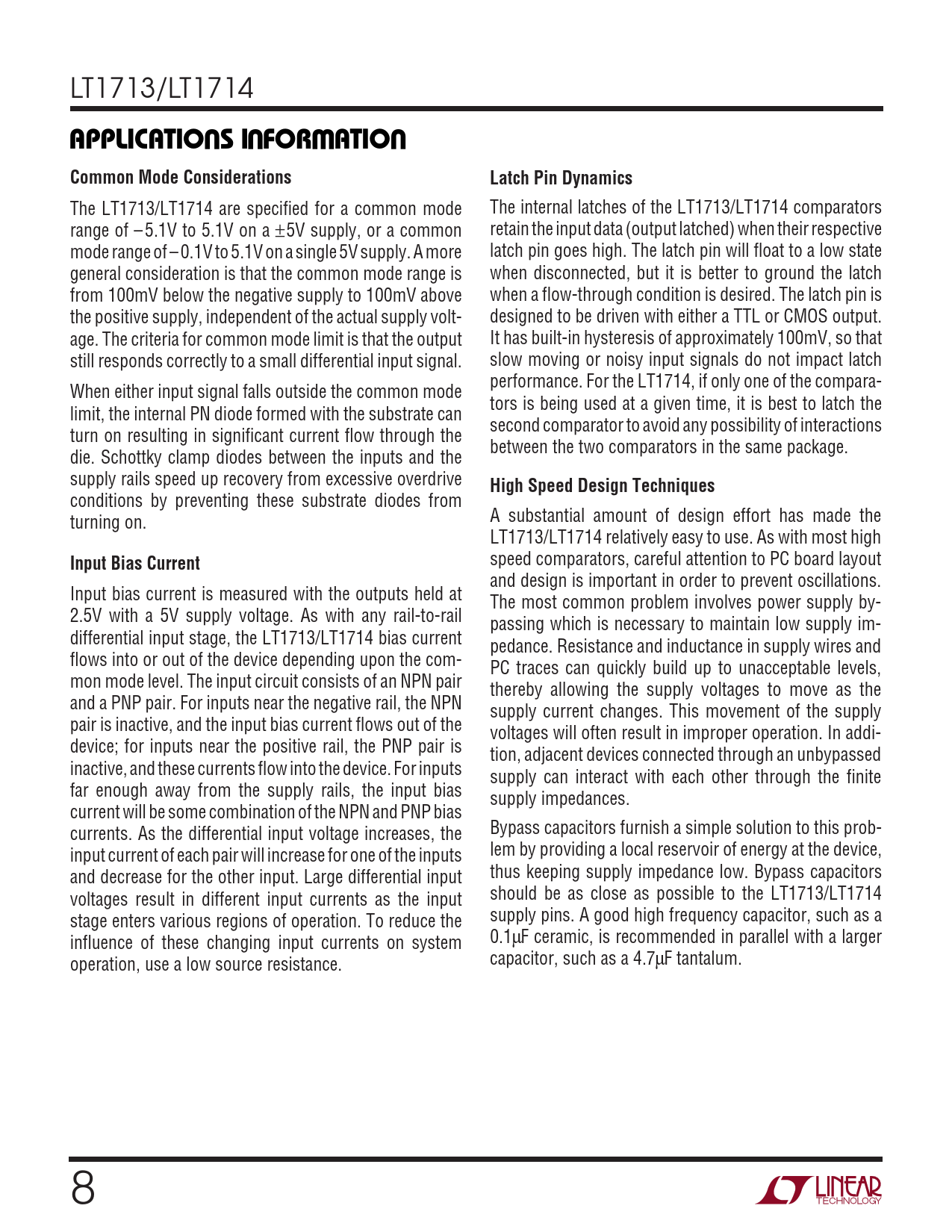 LT1713/LT1714 UUWUAPPLICATIO S I FOR ATIOCommon Mode ConsiderationsLatch Pin Dynamics The LT1713/LT1714 are specified for a common mode The internal latches of the LT1713/LT1714 comparators range of – 5.1V to 5.1V on a ±5V supply, or a common retain the input data (output latched) when their respective mode range of – 0.1V to 5.1V on a single 5V supply. A more latch pin goes high. The latch pin will float to a low state general consideration is that the common mode range is when disconnected, but it is better to ground the latch from 100mV below the negative supply to 100mV above when a flow-through condition is desired. The latch pin is the positive supply, independent of the actual supply volt- designed to be driven with either a TTL or CMOS output. age. The criteria for common mode limit is that the output It has built-in hysteresis of approximately 100mV, so that still responds correctly to a small differential input signal. slow moving or noisy input signals do not impact latch performance. For the LT1714, if only one of the compara- When either input signal falls outside the common mode tors is being used at a given time, it is best to latch the limit, the internal PN diode formed with the substrate can second comparator to avoid any possibility of interactions turn on resulting in significant current flow through the between the two comparators in the same package. die. Schottky clamp diodes between the inputs and the supply rails speed up recovery from excessive overdrive High Speed Design Techniques conditions by preventing these substrate diodes from turning on. A substantial amount of design effort has made the LT1713/LT1714 relatively easy to use. As with most high Input Bias Current speed comparators, careful attention to PC board layout and design is important in order to prevent oscillations. Input bias current is measured with the outputs held at The most common problem involves power supply by- 2.5V with a 5V supply voltage. As with any rail-to-rail passing which is necessary to maintain low supply im- differential input stage, the LT1713/LT1714 bias current pedance. Resistance and inductance in supply wires and flows into or out of the device depending upon the com- PC traces can quickly build up to unacceptable levels, mon mode level. The input circuit consists of an NPN pair thereby allowing the supply voltages to move as the and a PNP pair. For inputs near the negative rail, the NPN supply current changes. This movement of the supply pair is inactive, and the input bias current flows out of the voltages will often result in improper operation. In addi- device; for inputs near the positive rail, the PNP pair is tion, adjacent devices connected through an unbypassed inactive, and these currents flow into the device. For inputs supply can interact with each other through the finite far enough away from the supply rails, the input bias supply impedances. current will be some combination of the NPN and PNP bias currents. As the differential input voltage increases, the Bypass capacitors furnish a simple solution to this prob- input current of each pair will increase for one of the inputs lem by providing a local reservoir of energy at the device, and decrease for the other input. Large differential input thus keeping supply impedance low. Bypass capacitors voltages result in different input currents as the input should be as close as possible to the LT1713/LT1714 stage enters various regions of operation. To reduce the supply pins. A good high frequency capacitor, such as a influence of these changing input currents on system 0.1µF ceramic, is recommended in parallel with a larger operation, use a low source resistance. capacitor, such as a 4.7µF tantalum. 8
