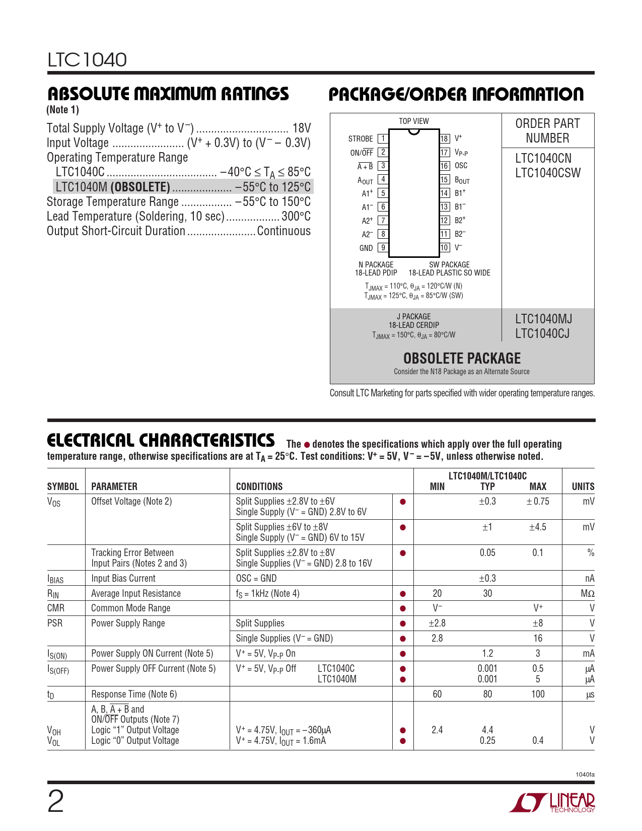 LTC1040 WWWUUWUABSOLUTE AXI U RATI GSPACKAGE/ORDER I FOR ATIO(Note 1) TOP VIEW ORDER PART Total Supply Voltage (V+ to V –) ... 18V STROBE 1 18 V+ NUMBER lnput Voltage .. (V+ + 0.3V) to (V – – 0.3V) ON/OFF 2 17 VP-P Operating Temperature Range LTC1040CN A + B 3 16 OSC LTC1040C ... – 40°C ≤ TA ≤ 85°C LTC1040CSW A 4 15 OUT BOUT LTC1040M (OBSOLETE) .. – 55°C to 125°C A1+ 5 14 B1+ Storage Temperature Range ... – 55°C to 150°C A1– 6 13 B1– Lead Temperature (Soldering, 10 sec).. 300°C A2+ 7 12 B2+ Output Short-Circuit Duration ... Continuous A2– 8 11 B2– GND 9 10 V– N PACKAGE SW PACKAGE 18-LEAD PDIP 18-LEAD PLASTIC SO WIDE TJMAX = 110°C, θJA = 120°C/W (N) TJMAX = 125°C, θJA = 85°C/W (SW) J PACKAGE LTC1040MJ 18-LEAD CERDIP TJMAX = 150°C, θJA = 80°C/W LTC1040CJ OBSOLETE PACKAGE Consider the N18 Package as an Alternate Source Consult LTC Marketing for parts specified with wider operating temperature ranges. ELECTRICAL CHARACTERISTICS The ● denotes the specifications which apply over the full operatingtemperature range, otherwise specifications are at TA = 25 ° C. Test conditions: V+ = 5V, V– = – 5V, unless otherwise noted.LTC1040M/LTC1040CSYMBOLPARAMETERCONDITIONSMINTYPMAXUNITS VOS Offset Voltage (Note 2) Split Supplies ±2.8V to ±6V ● ±0.3 ± 0.75 mV Single Supply (V– = GND) 2.8V to 6V Split Supplies ±6V to ±8V ● ±1 ±4.5 mV Single Supply (V– = GND) 6V to 15V Tracking Error Between Split Supplies ±2.8V to ±8V ● 0.05 0.1 % Input Pairs (Notes 2 and 3) Single Supplies (V– = GND) 2.8 to 16V IBIAS Input Bias Current OSC = GND ±0.3 nA RIN Average Input Resistance fS = 1kHz (Note 4) ● 20 30 MΩ CMR Common Mode Range ● V– V+ V PSR Power Supply Range Split Supplies ● ±2.8 ±8 V Single Supplies (V– = GND) ● 2.8 16 V IS(ON) Power Supply ON Current (Note 5) V+ = 5V, VP-P On ● 1.2 3 mA IS(OFF) Power Supply OFF Current (Note 5) V+ = 5V, VP-P Off LTC1040C ● 0.001 0.5 µA LTC1040M ● 0.001 5 µA tD Response Time (Note 6) 60 80 100 µs A, B, A + B and ON/OFF Outputs (Note 7) VOH Logic “1” Output Voltage V+ = 4.75V, lOUT = – 360µA ● 2.4 4.4 V VOL Logic “0” Output Voltage V+ = 4.75V, lOUT = 1.6mA ● 0.25 0.4 V 1040fa 2