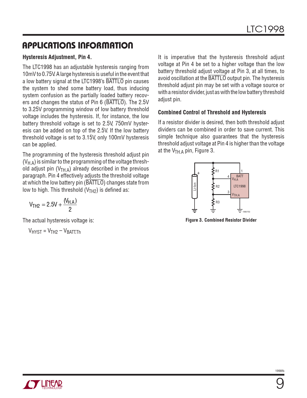 LTC1998 APPLICATIONS INFORMATIONHysteresis Adjustment, Pin 4. It is imperative that the hysteresis threshold adjust voltage at Pin 4 be set to a higher voltage than the low The LTC1998 has an adjustable hysteresis ranging from battery threshold adjust voltage at Pin 3, at all times, to 10mV to 0.75V. A large hysteresis is useful in the event that avoid oscillation at the BATTLO output pin. The hysteresis a low battery signal at the LTC1998’s BATTLO pin causes threshold adjust pin may be set with a voltage source or the system to shed some battery load, thus inducing with a resistor divider, just as with the low battery threshold system confusion as the partially loaded battery recov- adjust pin. ers and changes the status of Pin 6 (BATTLO). The 2.5V to 3.25V programming window of low battery threshold Combined Control of Threshold and Hysteresis voltage includes the hysteresis. If, for instance, the low battery threshold voltage is set to 2.5V, 750mV hyster- If a resistor divider is desired, then both threshold adjust esis can be added on top of the 2.5V. If the low battery dividers can be combined in order to save current. This threshold voltage is set to 3.15V, only 100mV hysteresis simple technique also guarantees that the hysteresis can be applied. threshold adjust voltage at Pin 4 is higher than the voltage at the V The programming of the hysteresis threshold adjust pin TH.A pin, Figure 3. (VH.A) is similar to the programming of the voltage thresh- old adjust pin (VTH.A) already described in the previous R1 + 1 paragraph. Pin 4 effectively adjusts the threshold voltage 4 BATT VH.A at which the low battery pin (BATTLO) changes state from R2 LTC1998 low to high. This threshold (VTH2) is defi ned as: Li-Ion 3 VTH.A V ( ) V = . V H.A R3 TH2 2 5 + 2 1998 F03 The actual hysteresis voltage is: Figure 3. Combined Resistor Divider VHYST = VTH2 – VBATT.Th 1998fb 9