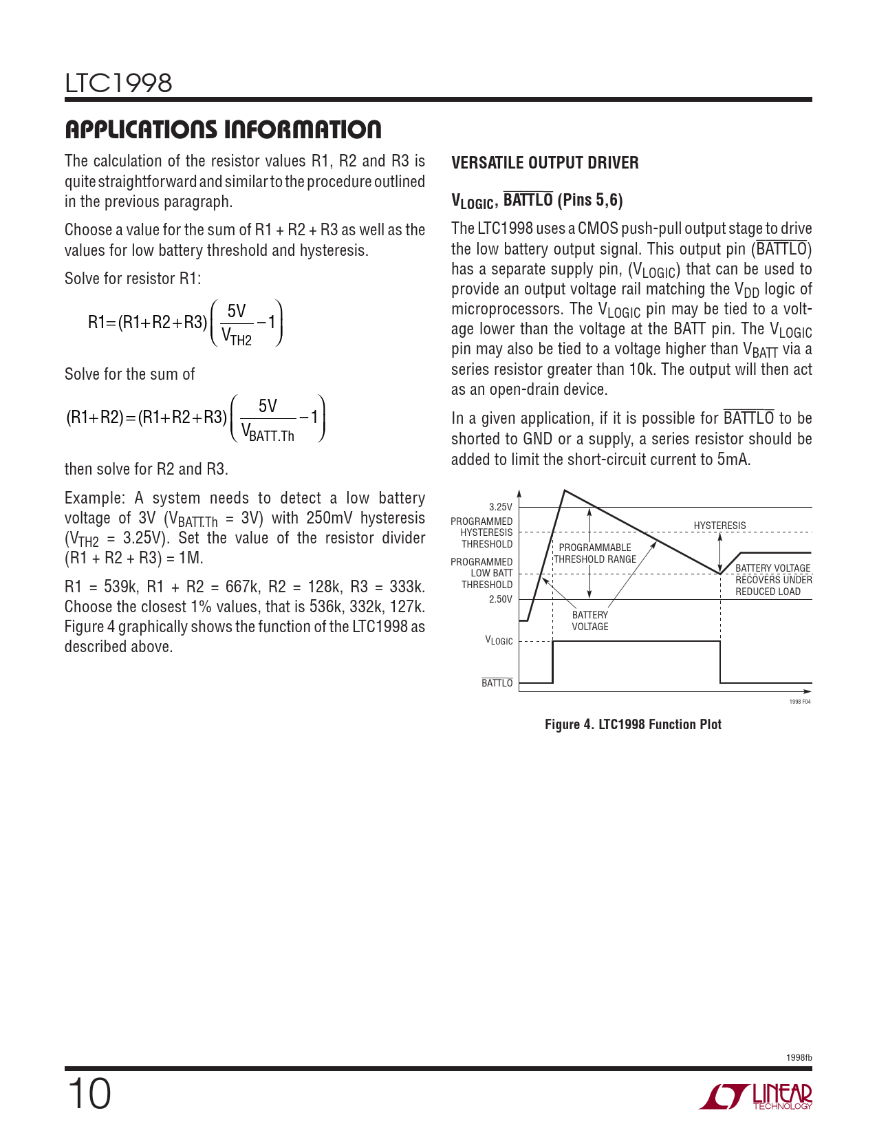 LTC1998 APPLICATIONS INFORMATION The calculation of the resistor values R1, R2 and R3 is VERSATILE OUTPUT DRIVER quite straightforward and similar to the procedure outlined in the previous paragraph. VLOGIC, BATTLO (Pins 5,6) Choose a value for the sum of R1 + R2 + R3 as well as the The LTC1998 uses a CMOS push-pull output stage to drive values for low battery threshold and hysteresis. the low battery output signal. This output pin (BATTLO) has a separate supply pin, (V Solve for resistor R1: LOGIC) that can be used to provide an output voltage rail matching the VDD logic of ⎛ 5V ⎞ microprocessors. The VLOGIC pin may be tied to a volt- R1= R ( 1+R2+R3) – 1 ⎝⎜ V ⎠⎟ age lower than the voltage at the BATT pin. The VLOGIC TH2 pin may also be tied to a voltage higher than VBATT via a Solve for the sum of series resistor greater than 10k. The output will then act as an open-drain device. ⎛ 5V ⎞ (R1+R ) 2 = (R1+R2+R ) 3 – 1 In a given application, if it is possible for BATTLO to be ⎝⎜ VBAT .TTh ⎠⎟ shorted to GND or a supply, a series resistor should be added to limit the short-circuit current to 5mA. then solve for R2 and R3. Example: A system needs to detect a low battery 3.25V voltage of 3V (VBATT.Th = 3V) with 250mV hysteresis PROGRAMMED HYSTERESIS (V HYSTERESIS TH2 = 3.25V). Set the value of the resistor divider THRESHOLD PROGRAMMABLE (R1 + R2 + R3) = 1M. THRESHOLD RANGE PROGRAMMED BATTERY VOLTAGE LOW BATT R1 = 539k, R1 + R2 = 667k, R2 = 128k, R3 = 333k. RECOVERS UNDER THRESHOLD REDUCED LOAD Choose the closest 1% values, that is 536k, 332k, 127k. 2.50V BATTERY Figure 4 graphically shows the function of the LTC1998 as VOLTAGE described above. VLOGIC BATTLO 1998 F04 Figure 4. LTC1998 Function Plot 1998fb 10