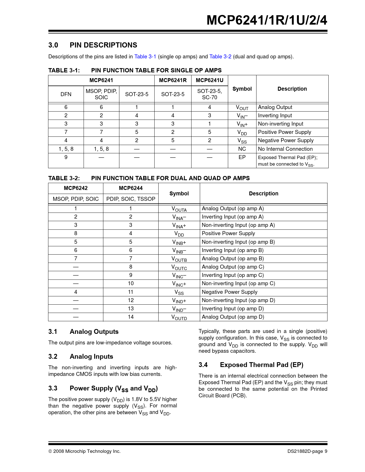 Typically, these parts are used in a single (positive) supply configuration. In this case, VSS is connected to The output pins are low-impedance voltage sources. ground and VDD is connected to the supply. VDD will need bypass capacitors.