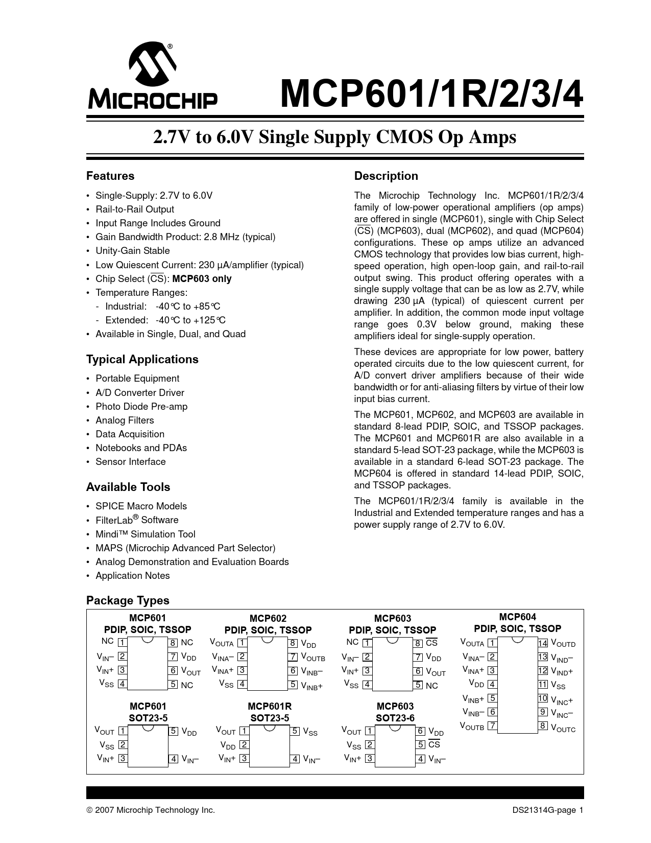 MCP601/1R/2/3/4. 2.7V to 6.0V Single Supply CMOS Op Amps. Features. Description. MCP603 only. Typical Applications. Available Tools