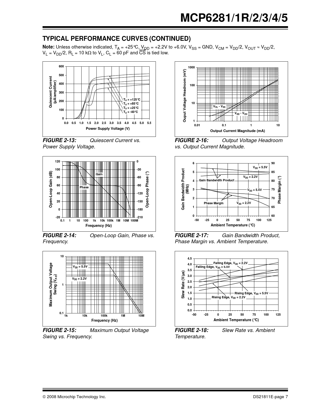 Slew Rate vs. Ambient Swing vs. Frequency. Temperature. © 2008 Microchip Technology Inc. DS21811E-page 7 Document Outline 1.0 Electrical Characteristics FIGURE 1-1: Timing Diagram for the Chip Select (CS) pin on the MCP6283 and MCP6285. 1.1 Test Circuits FIGURE 1-2: AC and DC Test Circuit for Most Non-Inverting Gain Conditions. FIGURE 1-3: AC and DC Test Circuit for Most Inverting Gain Conditions. 2.0 Typical Performance Curves FIGURE 2-1: Input Offset Voltage. FIGURE 2-2: Input Bias Current at TA = +85 ˚C. FIGURE 2-3: Input Offset Voltage vs. Common Mode Input Voltage at VDD = 2.2V. FIGURE 2-4: Input Offset Voltage Drift. FIGURE 2-5: Input Bias Current at TA = +125 ˚C. FIGURE 2-6: Input Offset Voltage vs. Common Mode Input Voltage at VDD = 5.5V. FIGURE 2-7: Input Offset Voltage vs. Output Voltage. FIGURE 2-8: CMRR, PSRR vs. Frequency. FIGURE 2-9: Input Bias, Offset Currents vs. Common Mode Input Voltage at TA = +85˚C. FIGURE 2-10: Input Bias, Input Offset Currents vs. Ambient Temperature. FIGURE 2-11: CMRR, PSRR vs. Ambient Temperature. FIGURE 2-12: Input Bias, Offset Currents vs. Common Mode Input Voltage at TA = +125˚C. FIGURE 2-13: Quiescent Current vs. Power Supply Voltage. FIGURE 2-14: Open-Loop Gain, Phase vs. Frequency. FIGURE 2-15: Maximum Output Voltage Swing vs. Frequency. FIGURE 2-16: Output Voltage Headroom vs. Output Current Magnitude. FIGURE 2-17: Gain Bandwidth Product, Phase Margin vs. Ambient Temperature. FIGURE 2-18: Slew Rate vs. Ambient Temperature. FIGURE 2-19: Input Noise Voltage Density vs. Frequency. FIGURE 2-20: Output Short Circuit Current vs. Power Supply Voltage. FIGURE 2-21: Quiescent Current vs. Chip Select (CS) Voltage at VDD = 2.2V (MCP6283 and MCP6285 only). FIGURE 2-22: Input Noise Voltage Density vs. Common Mode Input Voltage at 1 kHz. FIGURE 2-23: Channel-to-Channel Separation vs. Frequency (MCP6282 and MCP6284 only). FIGURE 2-24: Quiescent Current vs. Chip Select (CS) Voltage at VDD = 5.5V (MCP6283 and MCP6285 only). FIGURE 2-25: Large-Signal, Non-inverting Pulse Response. FIGURE 2-26: Small-Signal, Non-inverting Pulse Response. FIGURE 2-27: Chip Select (CS) to Amplifier Output Response Time at VDD = 2.2V (MCP6283 and MCP6285 only). FIGURE 2-28: Large-Signal, Inverting Pulse Response. FIGURE 2-29: Small-Signal, Inverting Pulse Response. FIGURE 2-30: Chip Select (CS) to Amplifier Output Response Time at VDD = 5.5V (MCP6283 and MCP6285 only). FIGURE 2-31: Measured Input Current vs. Input Voltage (below VSS). FIGURE 2-32: The MCP6281/1R/2/3/4/5 Show No Phase Reversal. 3.0 Pin Descriptions TABLE 3-1: Pin Function Table for Single Op Amps TABLE 3-2: Pin Function Table for Dual and Quad Op Amps 3.1 Analog Outputs 3.2 Analog Inputs 3.3 MCP6285’s VOUTA/VINB+ Pin 3.4 Chip Select Digital Input (CS) 3.5 Power Supply Pins 4.0 Application infoRmation 4.1 Rail-to-Rail Inputs FIGURE 4-1: Simplified Analog Input ESD Structures. FIGURE 4-2: Protecting the Analog Inputs. 4.2 Rail-to-Rail Output 4.3 Capacitive Loads FIGURE 4-3: Output Resistor, RISO stabilizes large capacitive loads. FIGURE 4-4: Recommended RISO Values for Capacitive Loads. 4.4 MCP628X Chip Select (CS) 4.5 Cascaded Dual Op Amps (MCP6285) FIGURE 4-5: Cascaded Gain Amplifier. 4.6 Supply Bypass 4.7 Unused Op Amps FIGURE 4-6: Unused Op Amps. 4.8 PCB Surface Leakage FIGURE 4-7: Example Guard Ring Layout for Inverting Gain. 4.9 Application Circuits FIGURE 4-8: Sallen-Key High-Pass Filter. FIGURE 4-9: Miller Integrator. FIGURE 4-10: Isolating the Load with a Buffer. FIGURE 4-11: Cascaded Gain Circuit Configuration. FIGURE 4-12: Difference Amplifier Circuit. FIGURE 4-13: Buffered Non-inverting Integrator with Chip Select. FIGURE 4-14: Integrator Circuit with Active Compensation. FIGURE 4-15: Second-Order Multiple Feedback Low-Pass Filter with an Extra Pole-Zero Pair. FIGURE 4-16: Second-Order Sallen-Key Low-Pass Filter with an Extra Pole-Zero Pair and Chip Select. FIGURE 4-17: Capacitorless Second-Order Low-Pass Filter with Chip Select. 5.0 Design AIDS 5.1 SPICE Macro Model 5.2 FilterLab® Software 5.3 Mindi™ Circuit Designer & Simulator 5.4 MAPS (Microchip Advanced Part Selector) 5.5 Analog Demonstration and Evaluation Boards 5.6 Application Notes 6.0 Packaging Information 6.1 Package Marking Information
