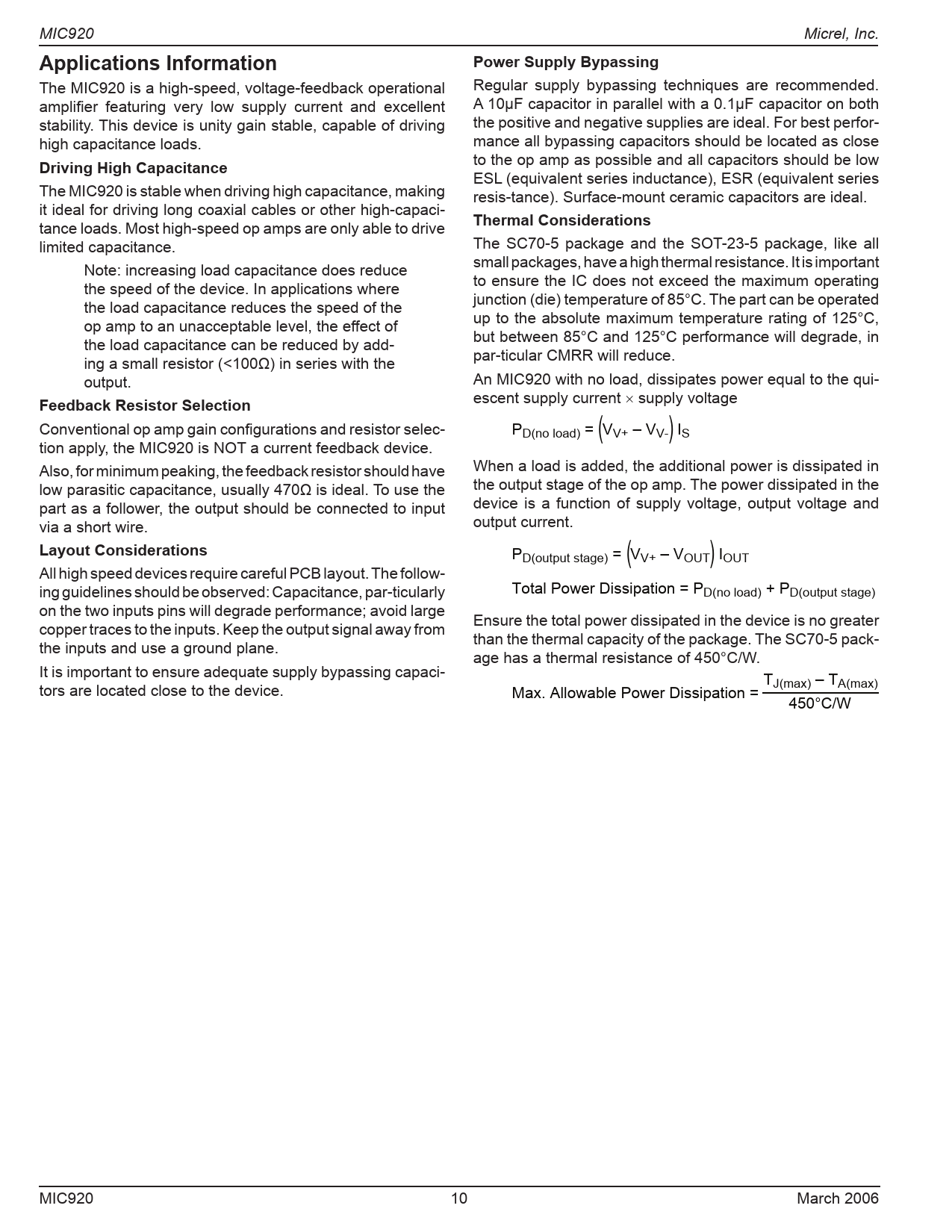 MIC920 Micrel, Inc. Applications InformationPower Supply Bypassing The MIC920 is a high-speed, voltage-feedback operational Regular supply bypassing techniques are recommended. amplifier featuring very low supply current and excellent A 10µF capacitor in parallel with a 0.1µF capacitor on both stability. This device is unity gain stable, capable of driving the positive and negative supplies are ideal. For best perfor- high capacitance loads. mance all bypassing capacitors should be located as close Driving High Capacitance to the op amp as possible and all capacitors should be low ESL (equivalent series inductance), ESR (equivalent series The MIC920 is stable when driving high capacitance, making resis-tance). Surface-mount ceramic capacitors are ideal. it ideal for driving long coaxial cables or other high-capaci- tance loads. Most high-speed op amps are only able to drive Thermal Considerations limited capacitance. The SC70-5 package and the SOT-23-5 package, like all Note: increasing load capacitance does reduce smal packages, have a high thermal resistance. It is important the speed of the device. In applications where to ensure the IC does not exceed the maximum operating the load capacitance reduces the speed of the junction (die) temperature of 85°C. The part can be operated op amp to an unacceptable level, the effect of up to the absolute maximum temperature rating of 125°C, the load capacitance can be reduced by add- but between 85°C and 125°C performance will degrade, in ing a small resistor (<100Ω) in series with the par-ticular CMRR will reduce. output. An MIC920 with no load, dissipates power equal to the qui- Feedback Resistor Selection escent supply current × supply voltage Conventional op amp gain configurations and resistor selec- PD(no load) = VV+ – VV- I ( ) S tion apply, the MIC920 is NOT a current feedback device. Also, for minimum peaking, the feedback resistor should have When a load is added, the additional power is dissipated in low parasitic capacitance, usually 470Ω is ideal. To use the the output stage of the op amp. The power dissipated in the part as a follower, the output should be connected to input device is a function of supply voltage, output voltage and via a short wire. output current. Layout Considerations PD(output stage) = VV+ – VOUT I ( ) OUT All high speed devices require careful PCB layout. The follow- ing guidelines should be observed: Capacitance, par-ticularly Total Power Dissipation = PD(no load) + PD(output stage) on the two inputs pins will degrade performance; avoid large copper traces to the inputs. Keep the output signal away from Ensure the total power dissipated in the device is no greater the inputs and use a ground plane. than the thermal capacity of the package. The SC70-5 pack- age has a thermal resistance of 450°C/W. It is important to ensure adequate supply bypassing capaci- T tors are located close to the device. Max. Allowable Power Dissipation = J(max) – TA(max) 450°C/W MIC920 10 March 2006
